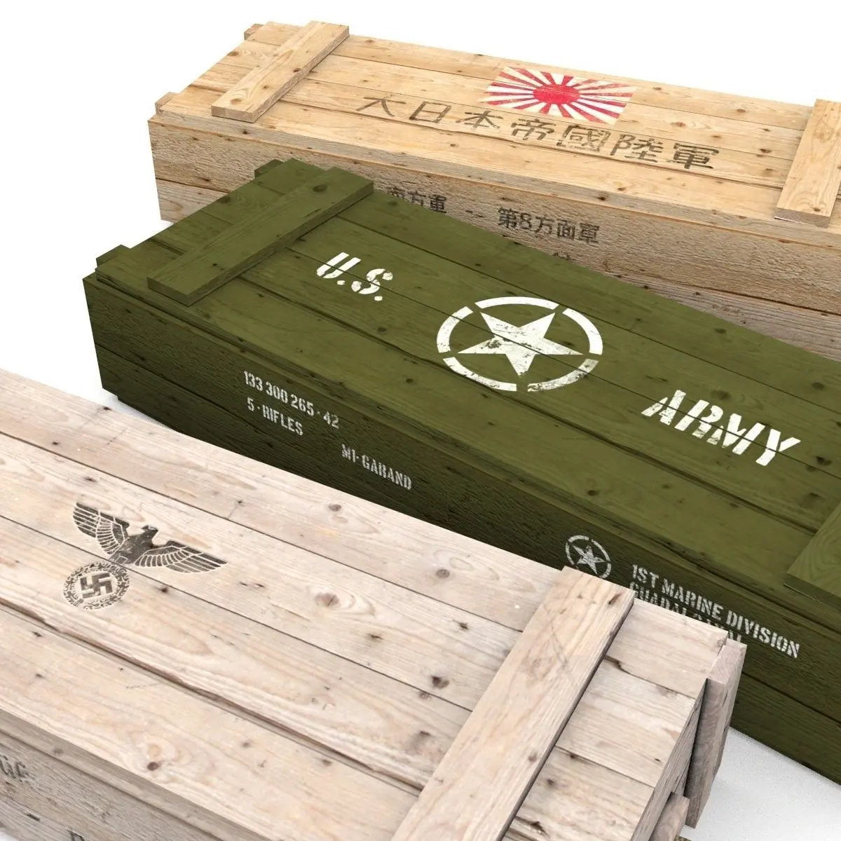 A collection of military crates used during the WWII. 3 models included in the collection : US Army crate for M1 Garand rifle, German Army for Panzerfaust and Japanese Imperial Army for Arisaka Type 99 rifle.