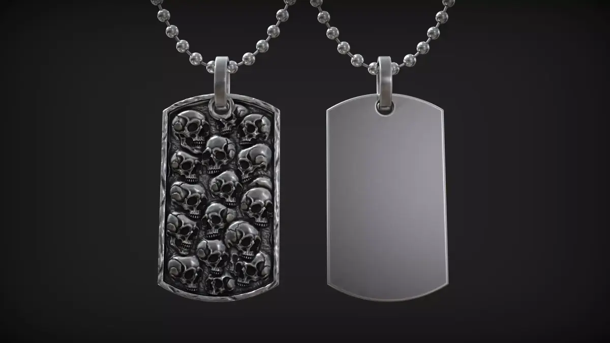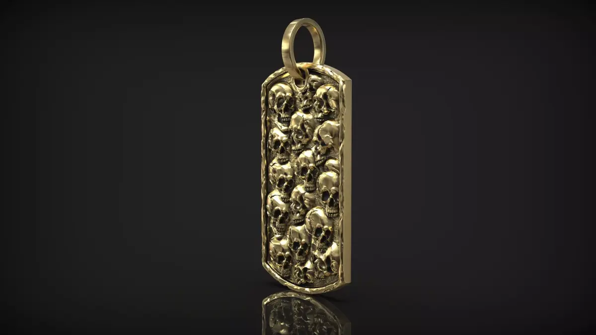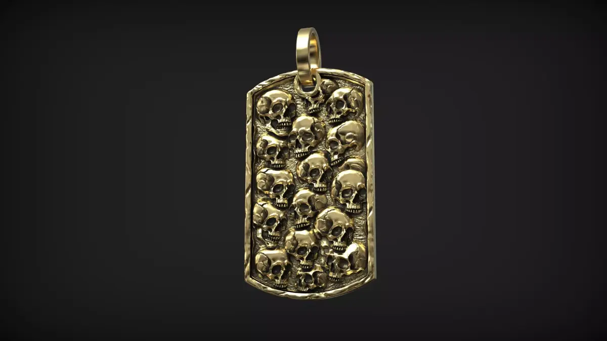 This 3D model features a rectangular pendant covered with detailed skull reliefs, designed in a dark gothic and biker-inspired style. The composition of overlapping skulls creates a powerful visual statement symbolizing mortality, rebellion, and strength.