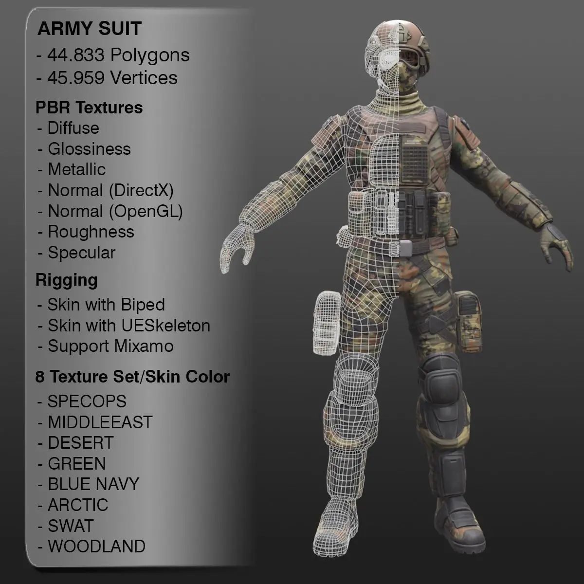 Unreal Engine 5.3.1 - Rigged with bones (Biped, UESkeleton) - Character Blueprint Inculded - Press 1-8 to change skin (BIPED). - Press Num 1-8 to change skin (UESKELETON). - 3D environment not included. - 43.987 Polygons, 45.754 Vertices