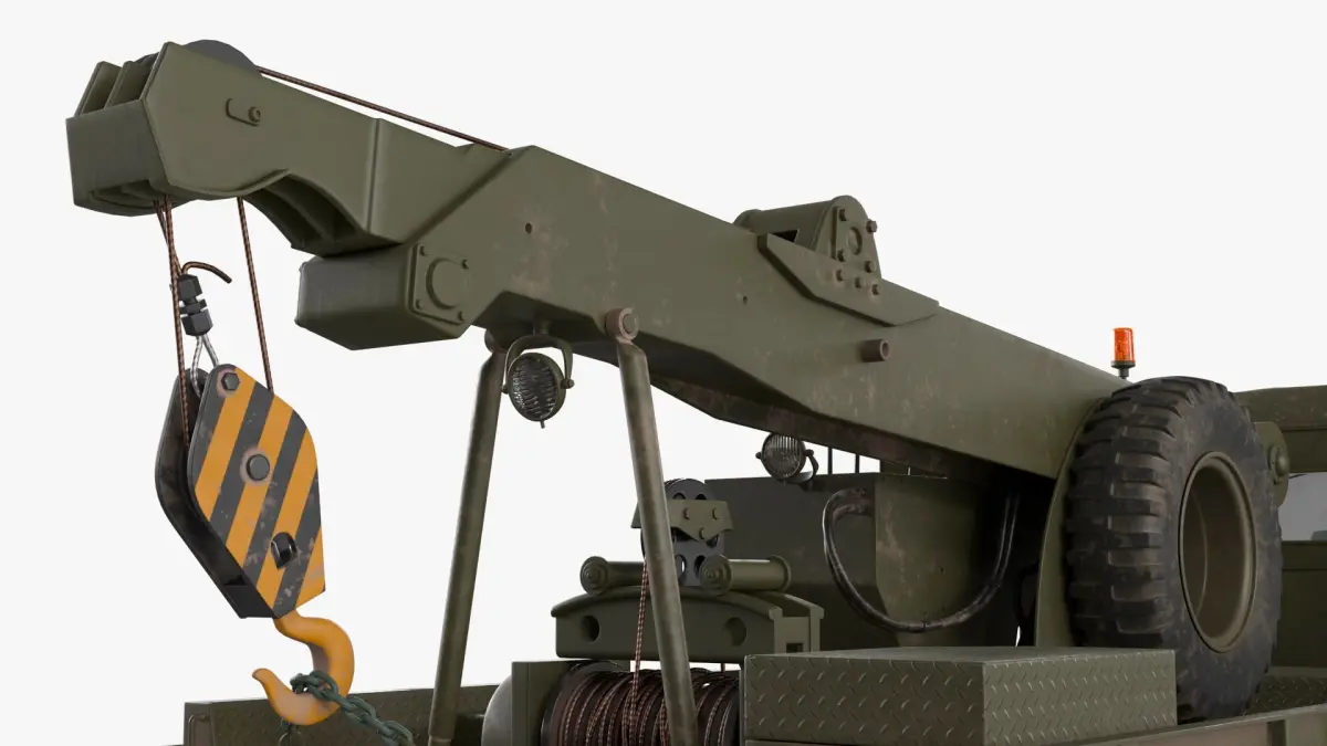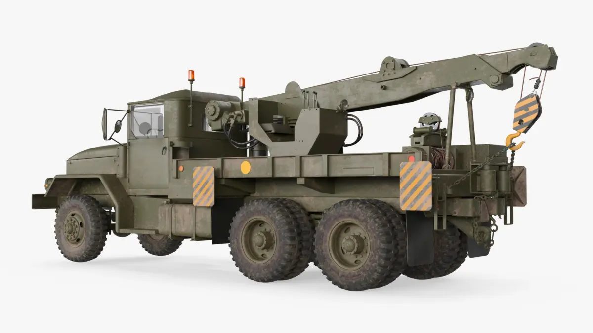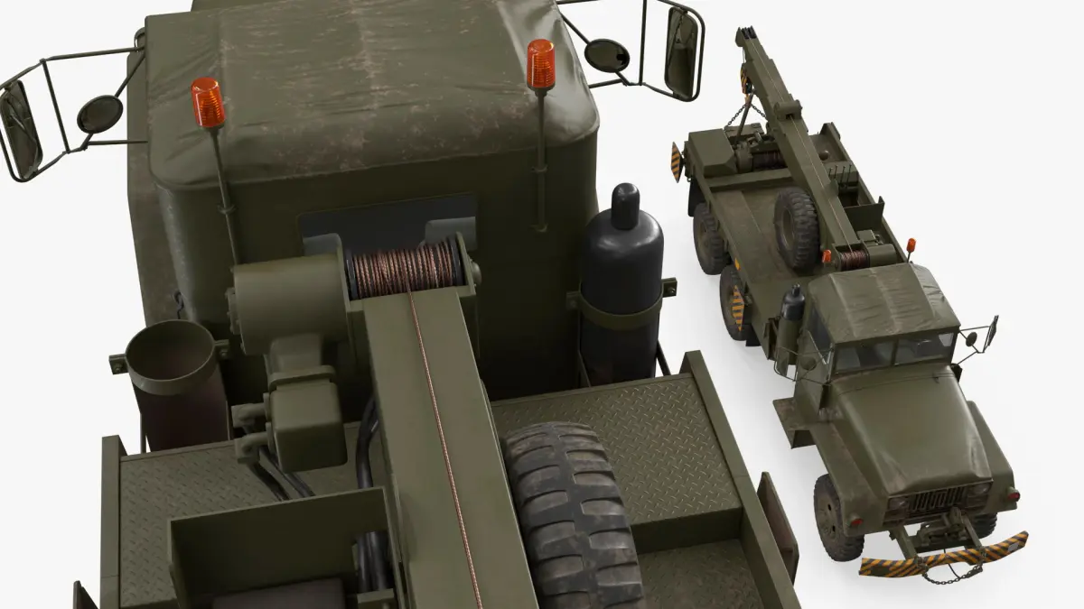 For army logistics visualization, defense training simulations, vehicle recovery demonstrations, historical military reconstructions, video game development, and industrial equipment presentations focused on transport and recovery machinery.