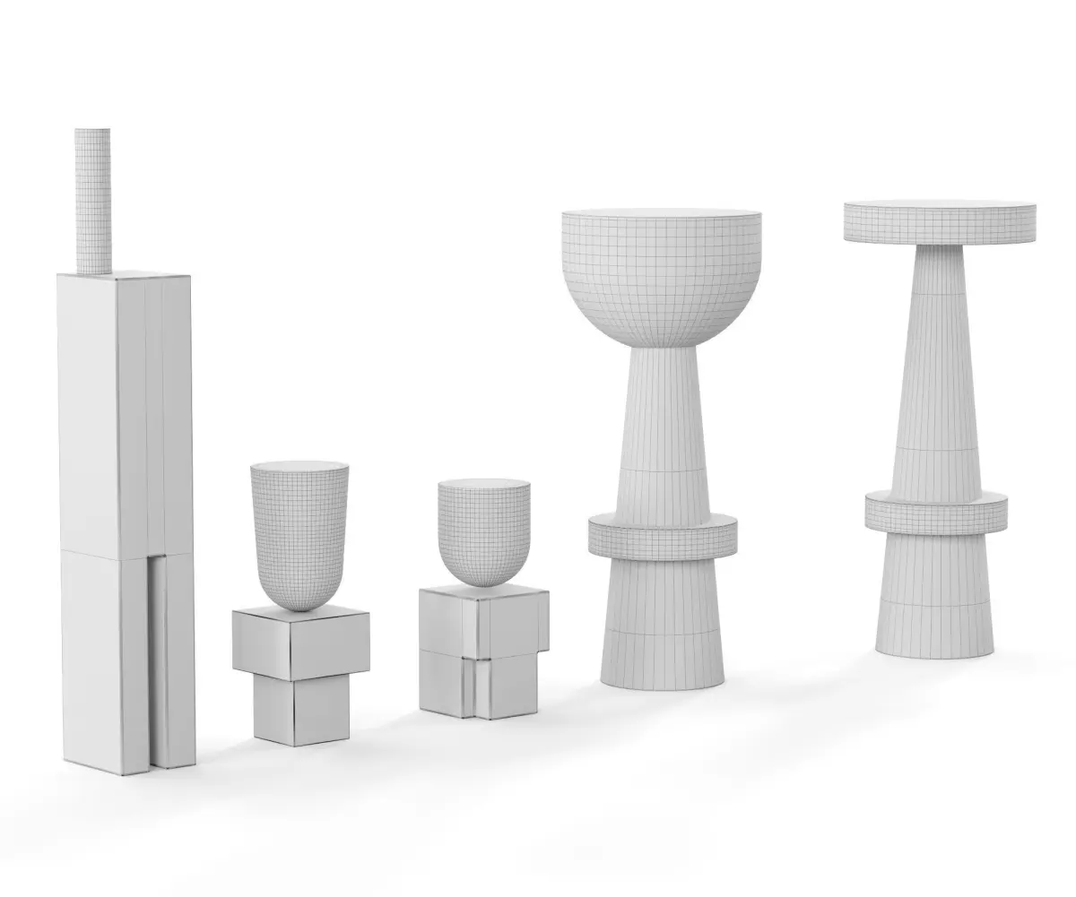3D model of various statues / vases designed by designer Arno Declercq in wood material.Mesh mainly based on quads, smooth and clean; ready to be used in product visualization or archviz.