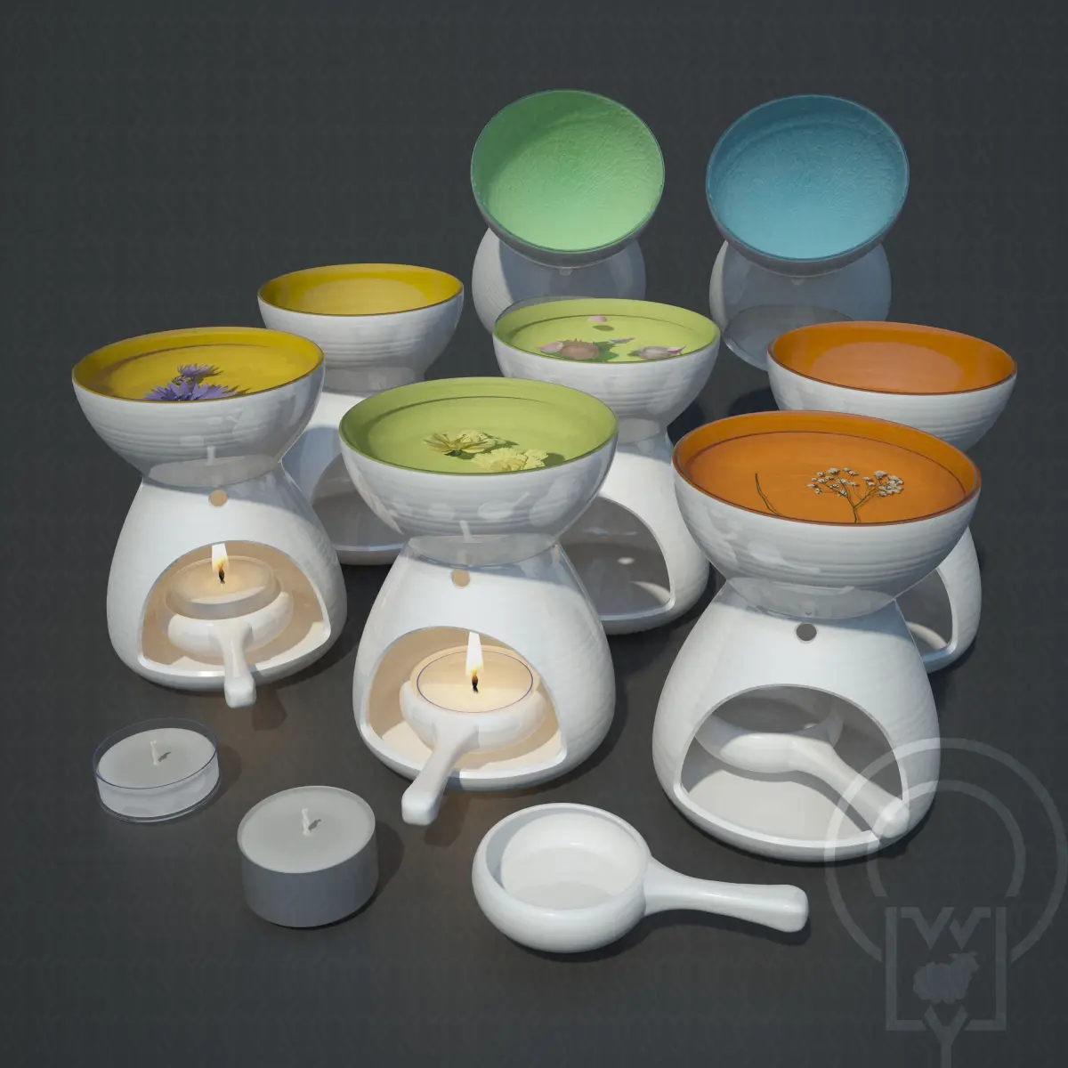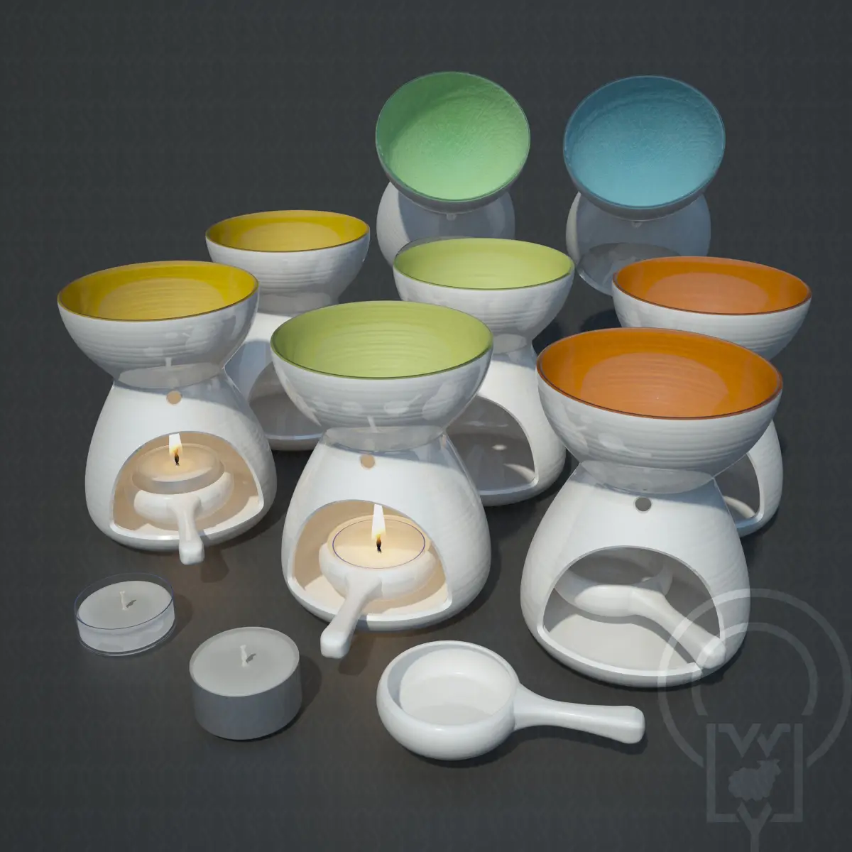 Accent colour oil burners; shattered glass effect (blue, jade green), thin lines, thick lines (yellow, orange, green)