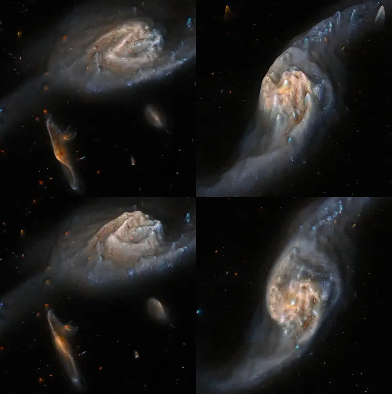 This image from the NASA/ESA Hubble Space Telescope shows two of the galaxies in the galactic triplet Arp 248 – also known as Wild's Triplet – which lies around 200 million light-years from Earth in the constellation Virgo. The two large spiral galaxies visible in this image – which flank a smaller, unrelated background spiral galaxy – appear connected by a luminous bridge. This elongated stream of stars and interstellar dust is known as a tidal tail, and it formed by the mutual gravitational attraction of the two foreground galaxies.