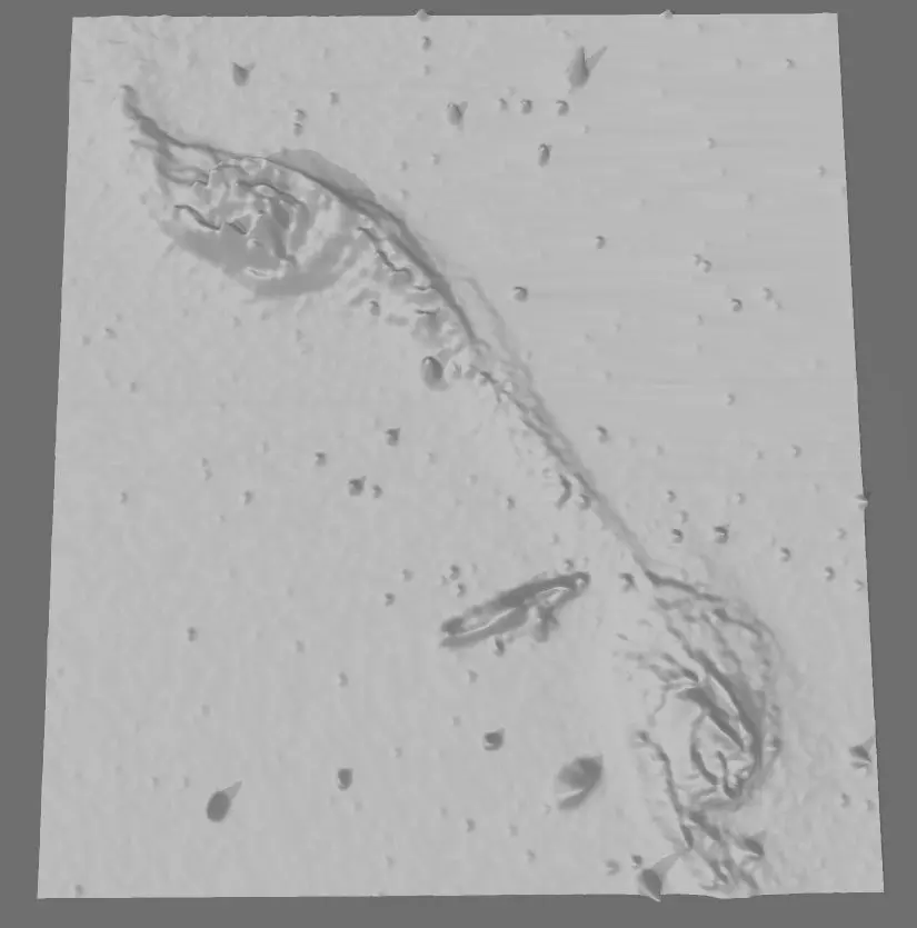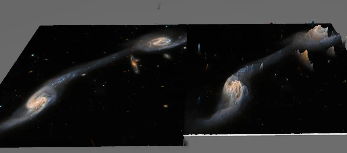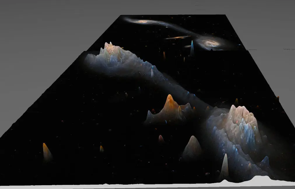 Galaxyes, whose light traveled thousand years for the our Spaces Telescope to record its photons!Where the material becomes denser, as a result of physical processes, it will be brighter and warmer, like as the sun! Somehow, the thickening matter creates deeper and deeper holes in space-time. Based on this, I created the negative gravity map of the image with the help of software, as gravity distorts a deep pit in space-time, the texture rises on the model, thus creating gravity mountains!