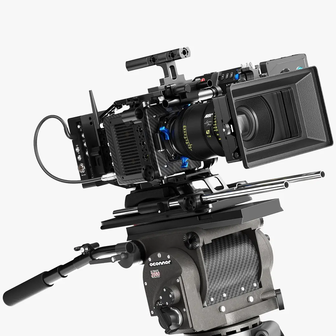 A bundle of 3D models featuring ARRI professional cinema cameras with different accessory sets, as well as ARRI Orbiter LED fixtures in blue and black.