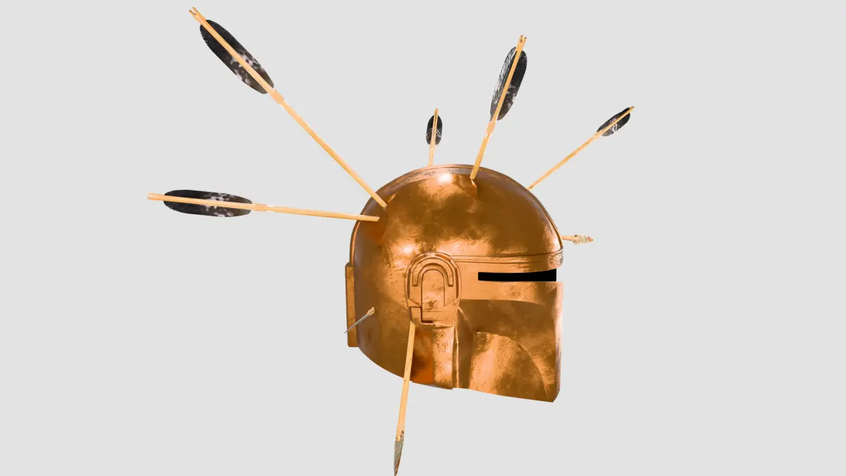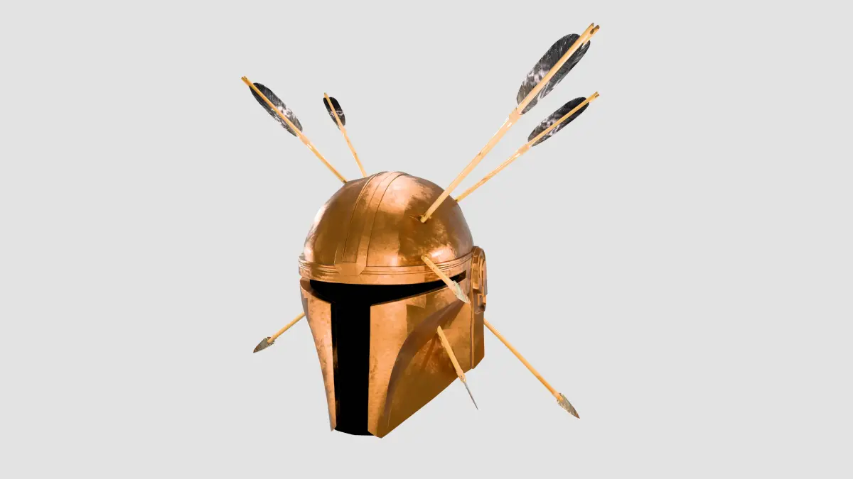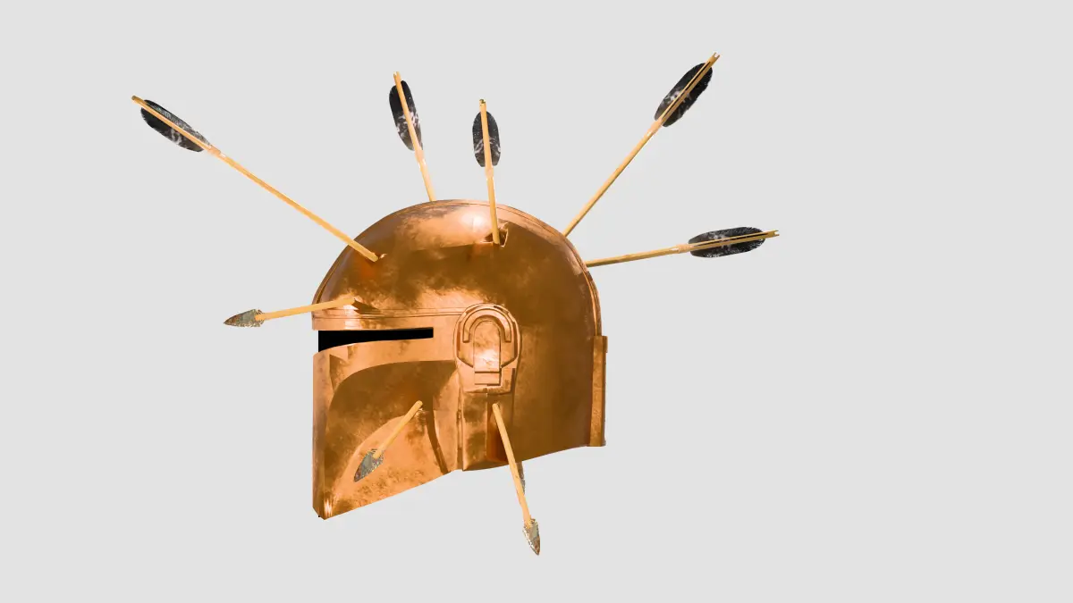 This is a high quality sci-fi Mandalorian helmet modeled with realistic arrow impacts and post-battle damage. The helmet is designed with a stylized yet grounded look featuring multiple embedded arrows and a weathered copper-like metallic finish. It is fully optimized for game engines such as Unity and Unreal Engine, with clean topology, proper UVs, and game-ready geometry.
