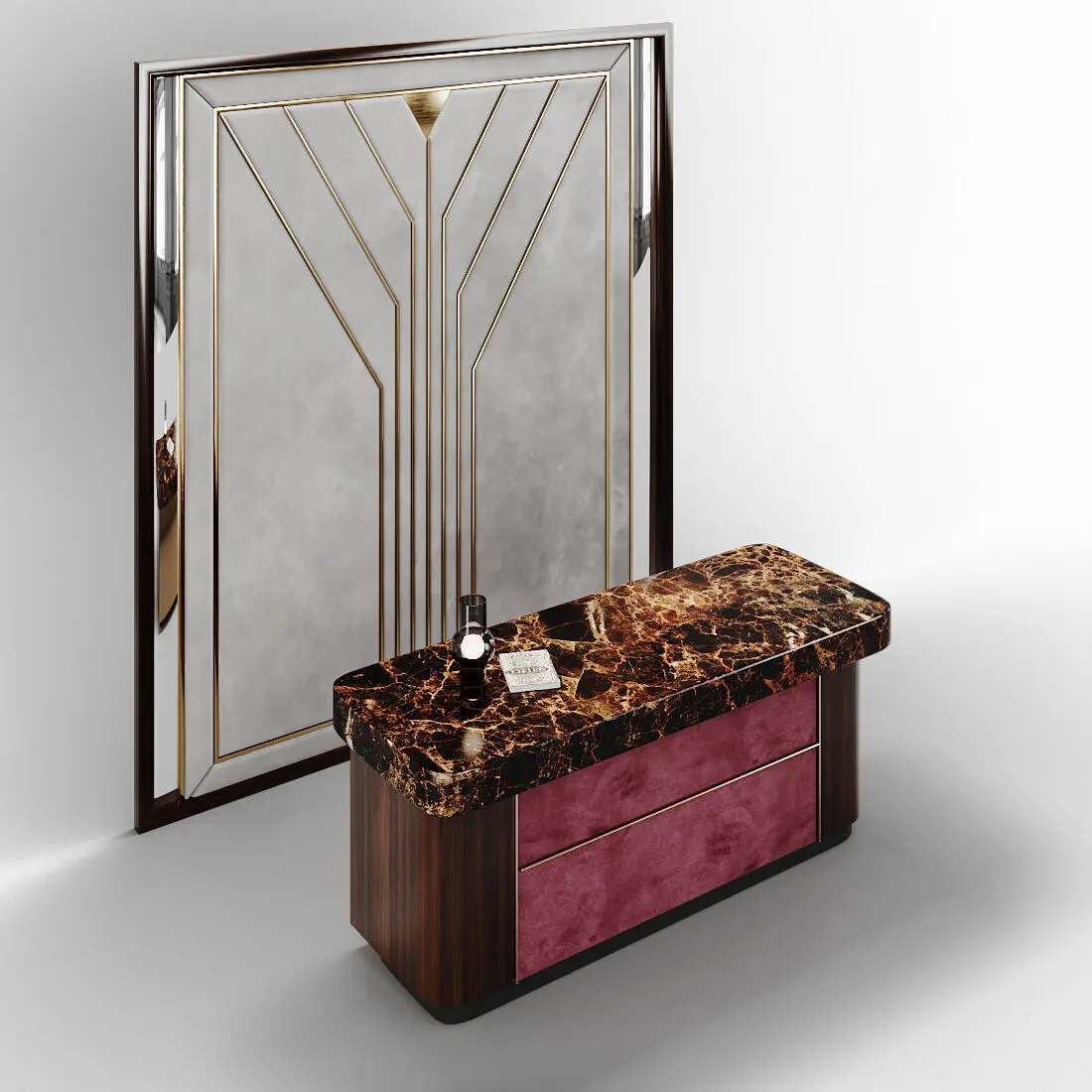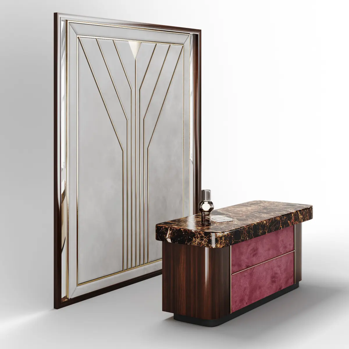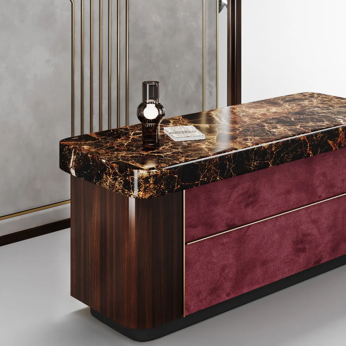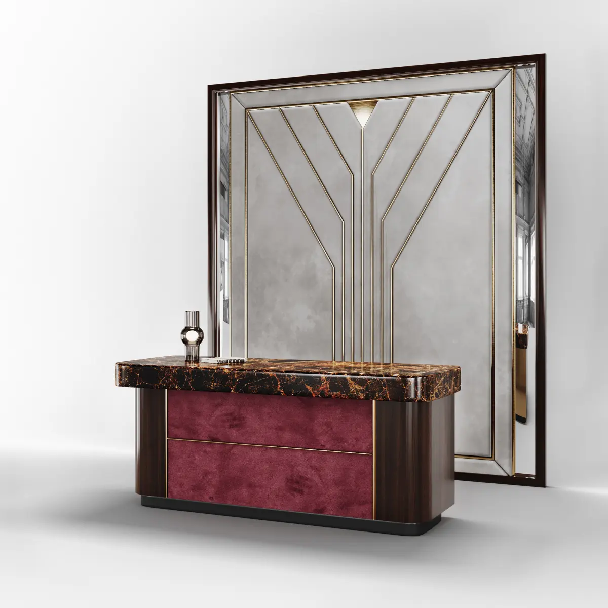 Crafted with a polished marble countertop, lacquered wood base, and accents of rich fabric and gold detailing, the desk exudes opulence and timeless charm. Its smooth, curvaceous form is complemented by a striking decorative panel positioned behind the counter. This panel, measuring H 3050mm x W 2730mm, features an intricately carved wooden frame in the Art Deco style, adorned with gold elements and flanked by sleek mirrors on both sides, adding depth and grandeur to the design. The interplay of materials—marble, lacquered wood, fabric, gold, and mirror—creates a bold yet refined aesthetic, perfect for luxurious spaces, modern interior design, or promotional projects for premium decor brands.