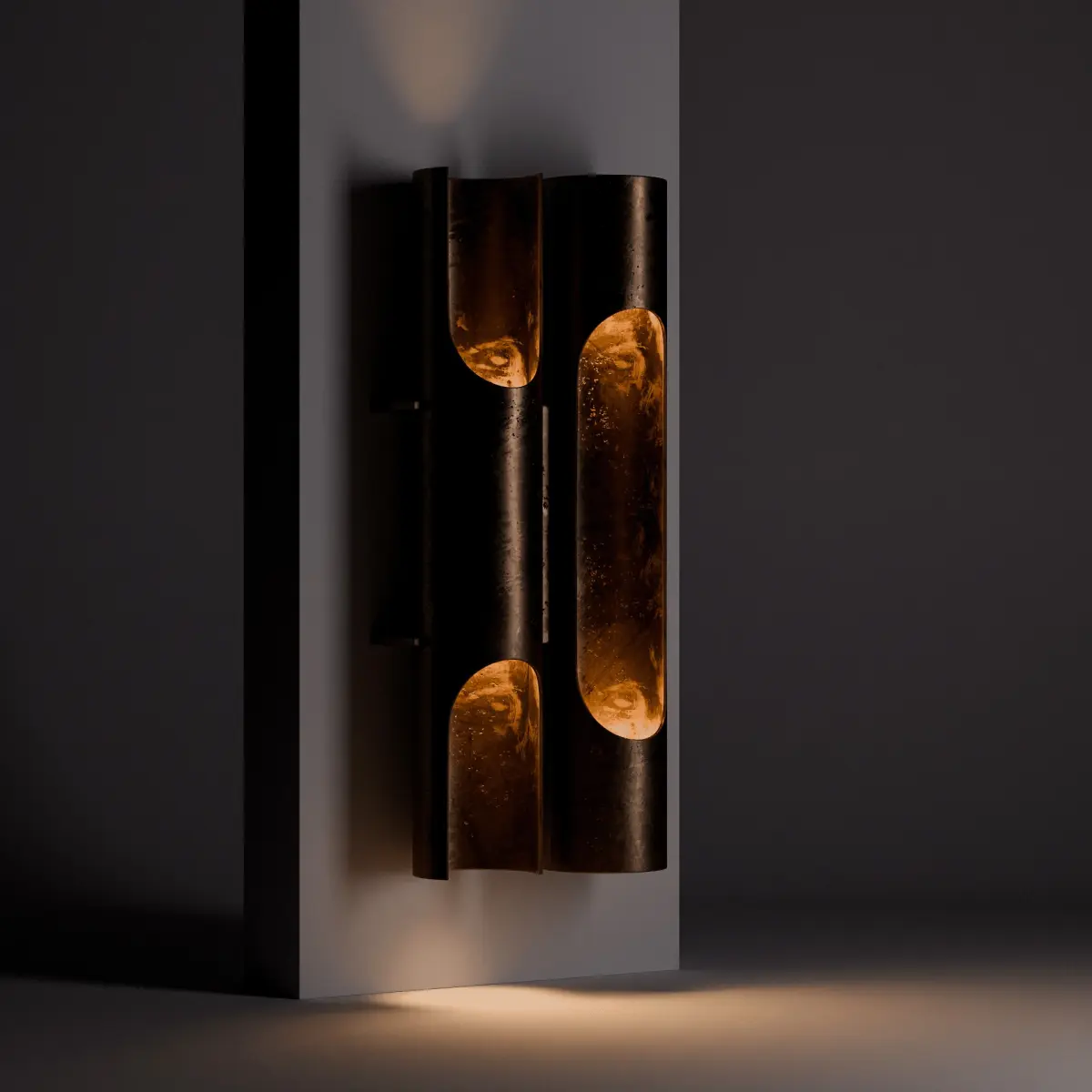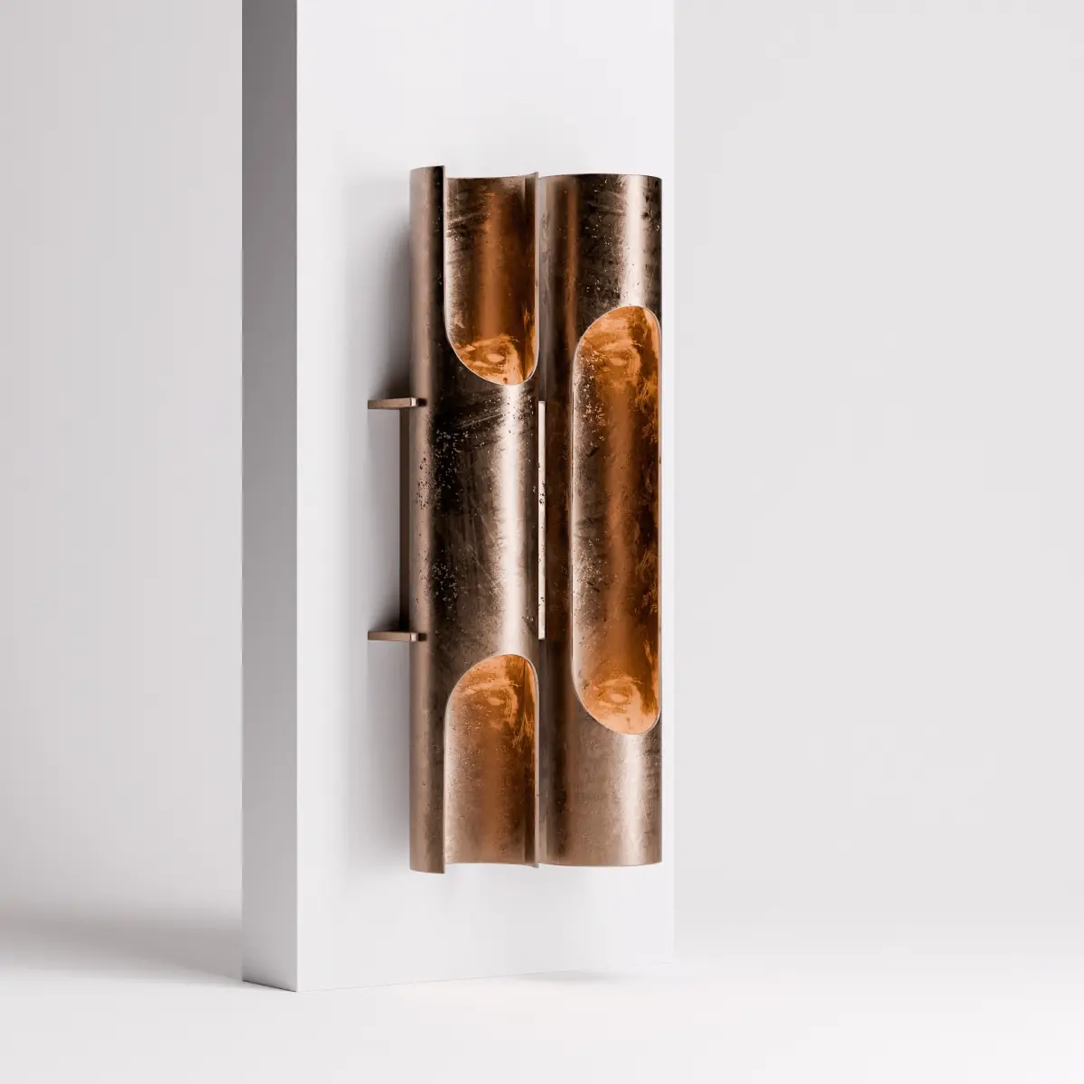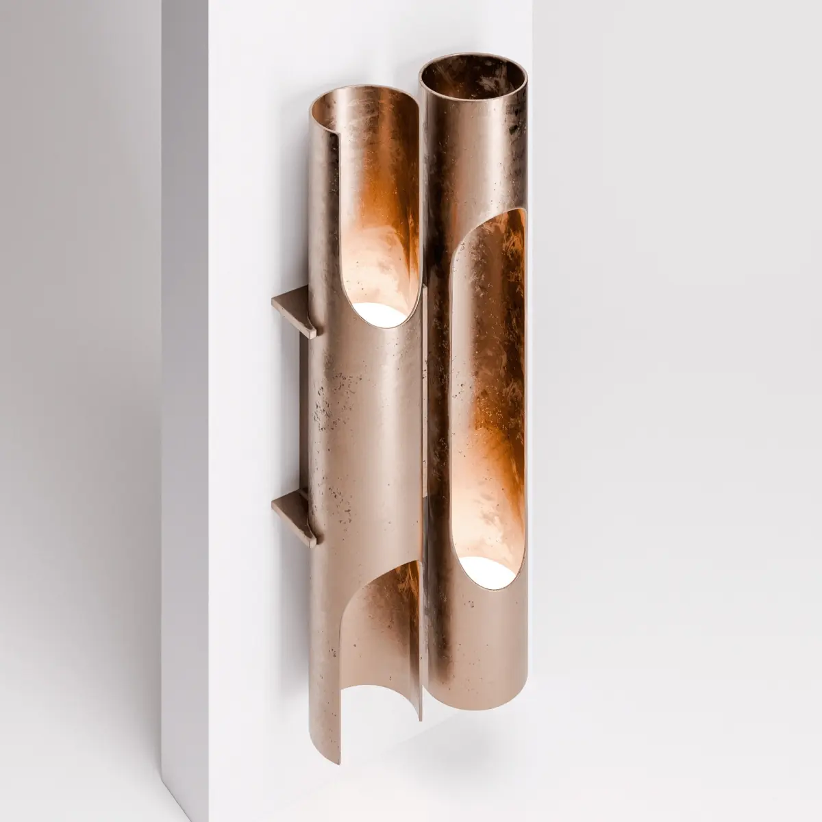 This Art Deco Wall Sconce from the 1930s showcases a sleek, modernist design. The fixture consists of two polished metal tubes with a curving, elongated form. The tubes are mounted on a brass base and are designed to diffuse light through their open, cut-out sections, highlighting the smooth, reflective surface. The design is minimal yet elegant, embodying the luxurious and geometric aesthetics typical of Dutch Art Deco during that period.