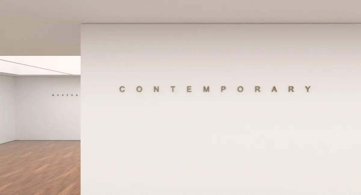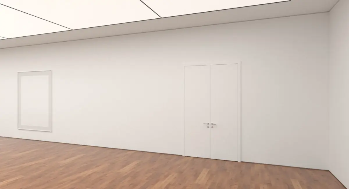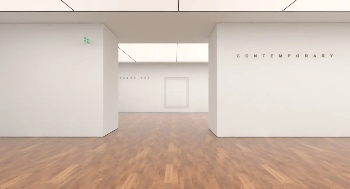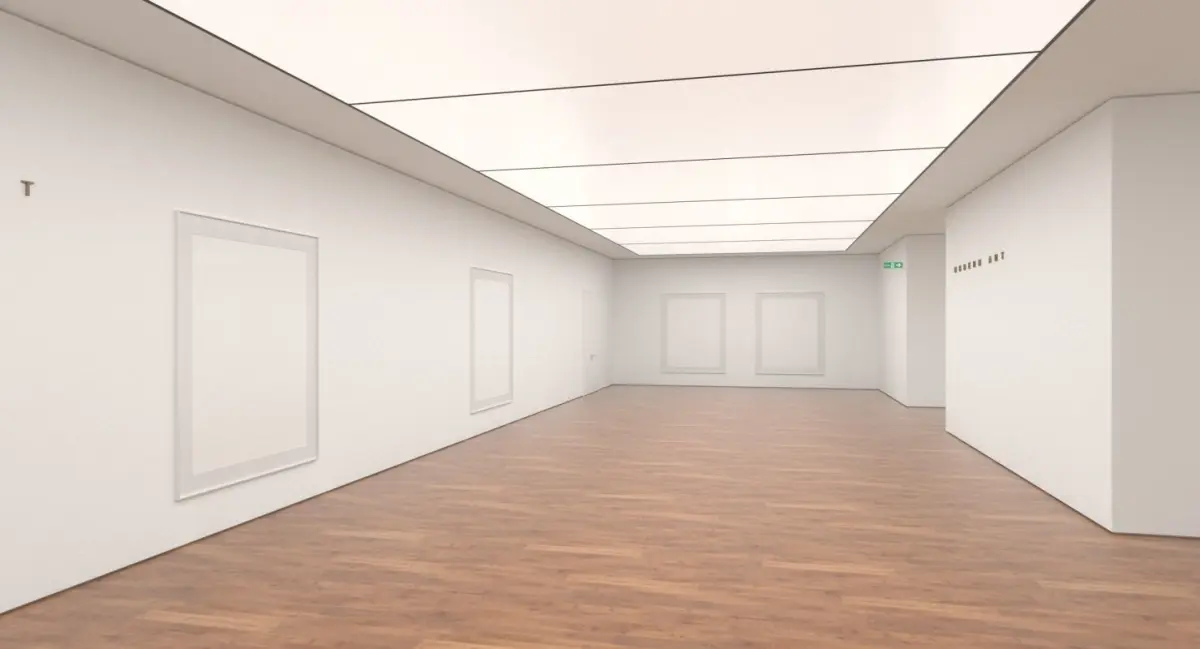 A detailed 3D model scene of a modern, contemporary art gallery / exhibition / museum / studio.