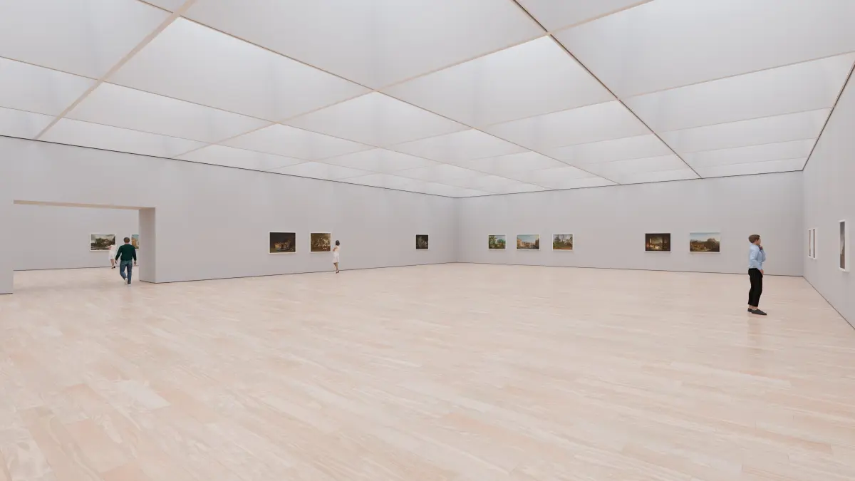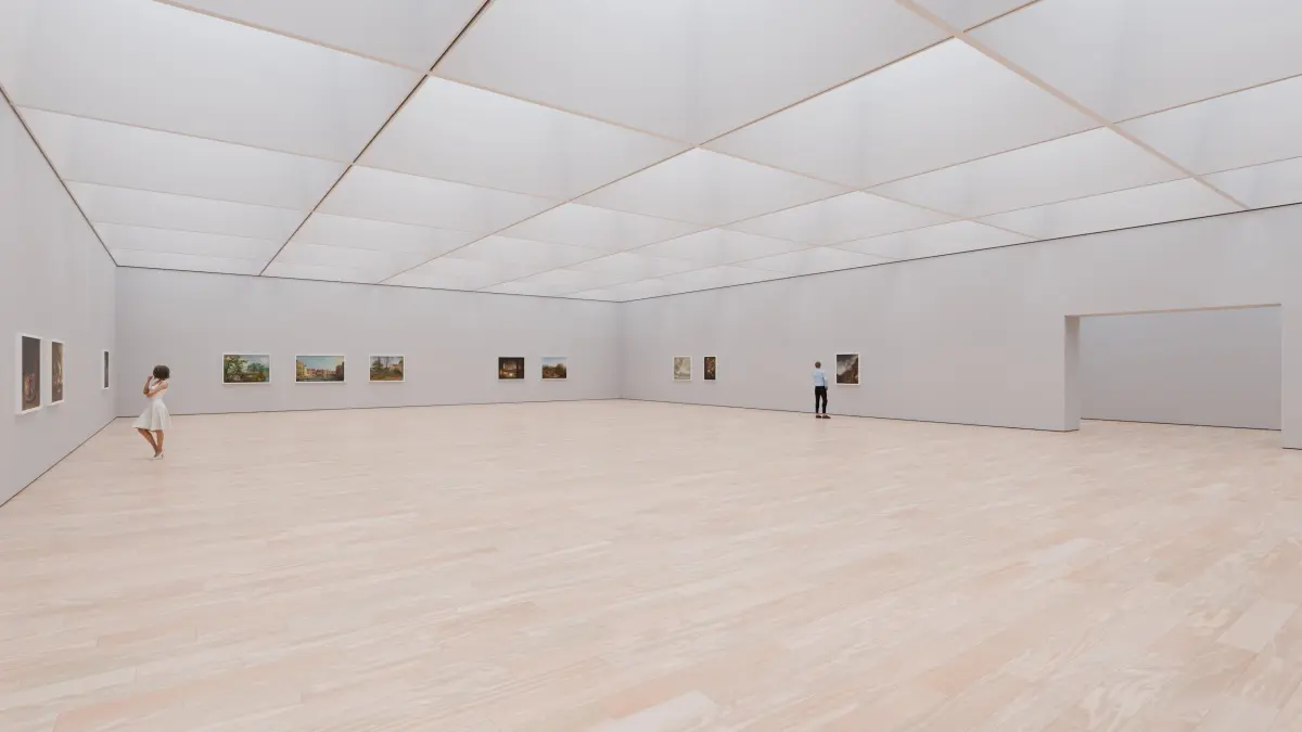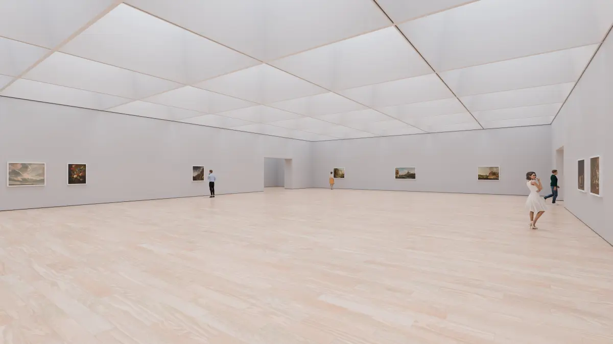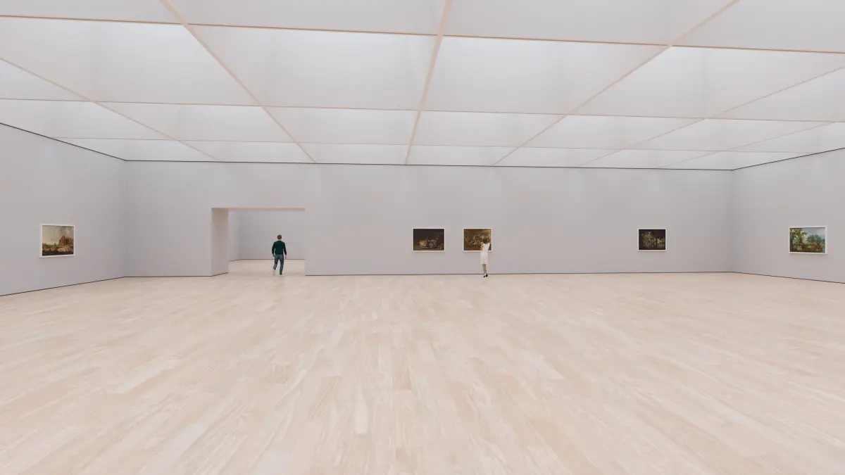 The floor, walls and paintings (front) are textured. Rest of the scene is not UV unwrapped.