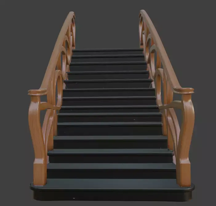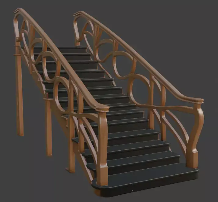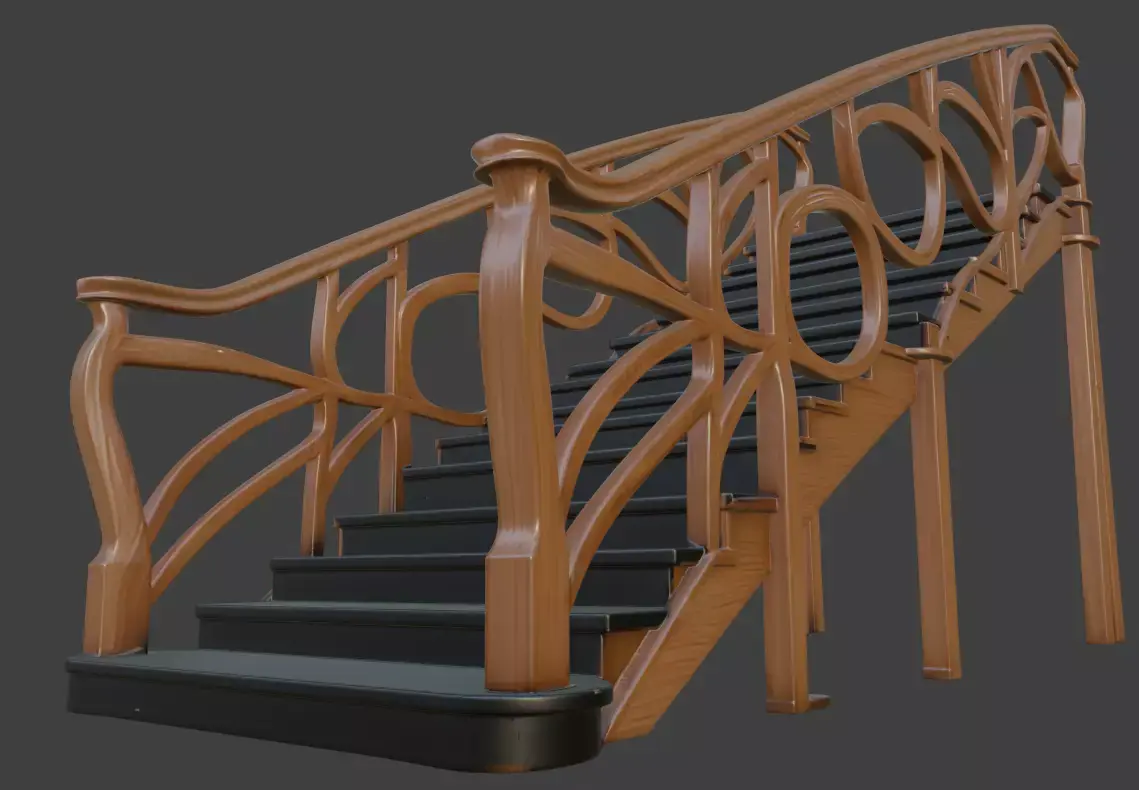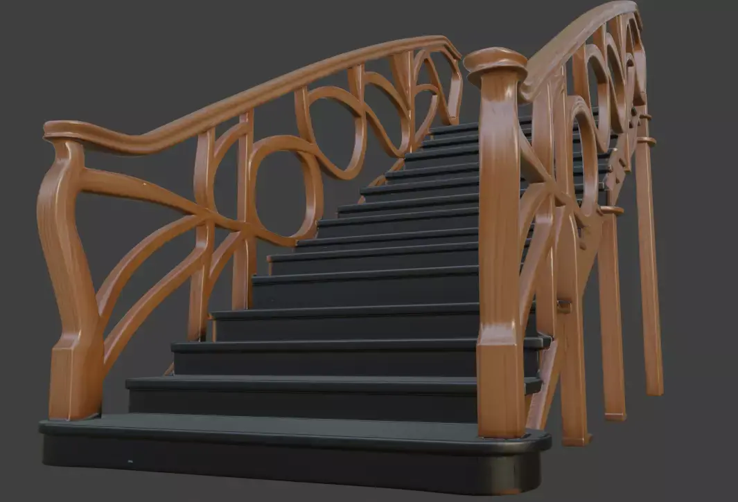 Highly detailed, game-ready and archviz-ready Art Nouveau staircase 3D model featuring rich polished wood with flowing organic handrails, intricate swirling side panels, and deep black marble treads. Clean quad topology, fully UV-unwrapped, 4K PBR textures included (BaseColor, Normal, Roughness, Metallic, AO, Height). Perfect for luxury interior renders, historical reconstructions, high-end real-time projects, VR, and cinematic scenes.