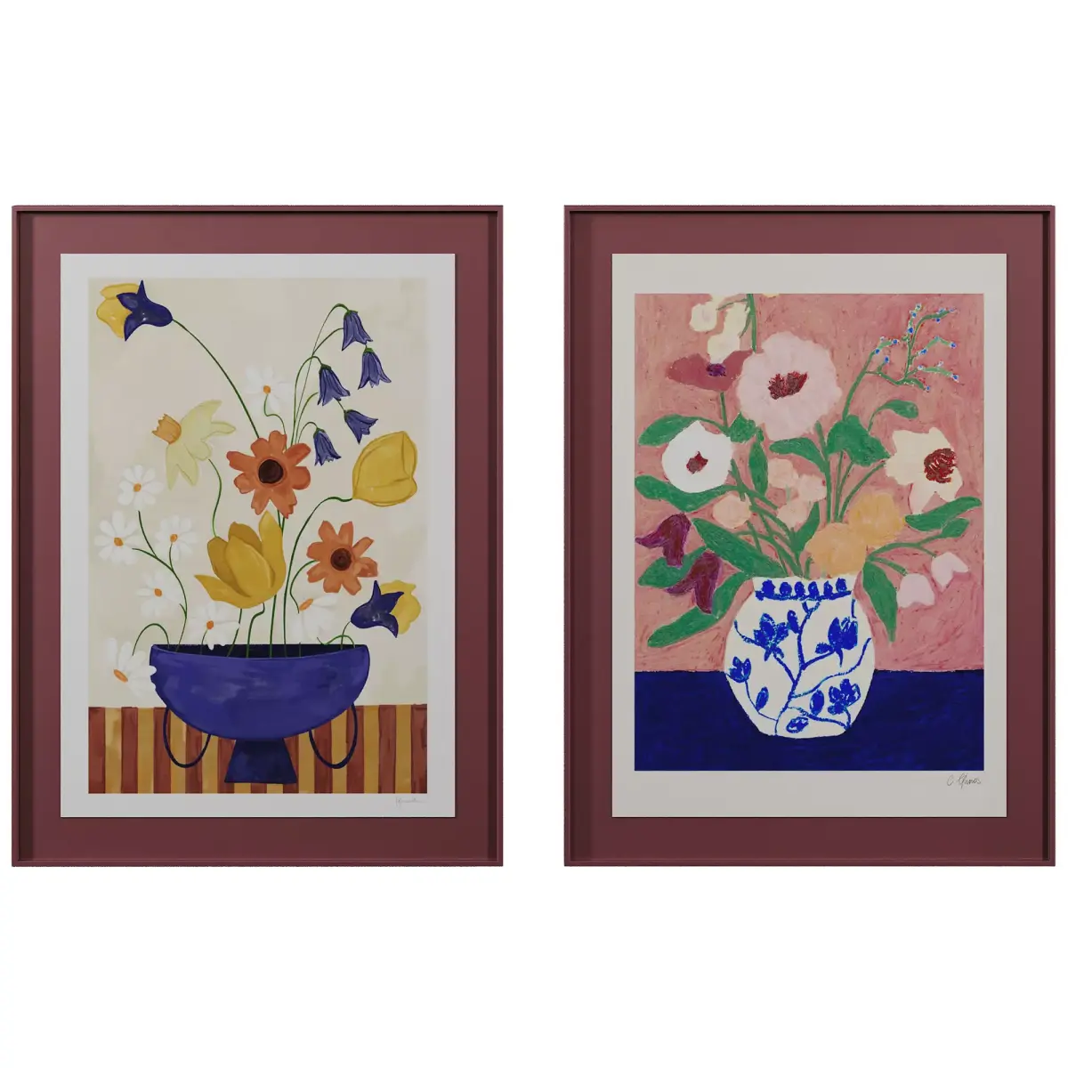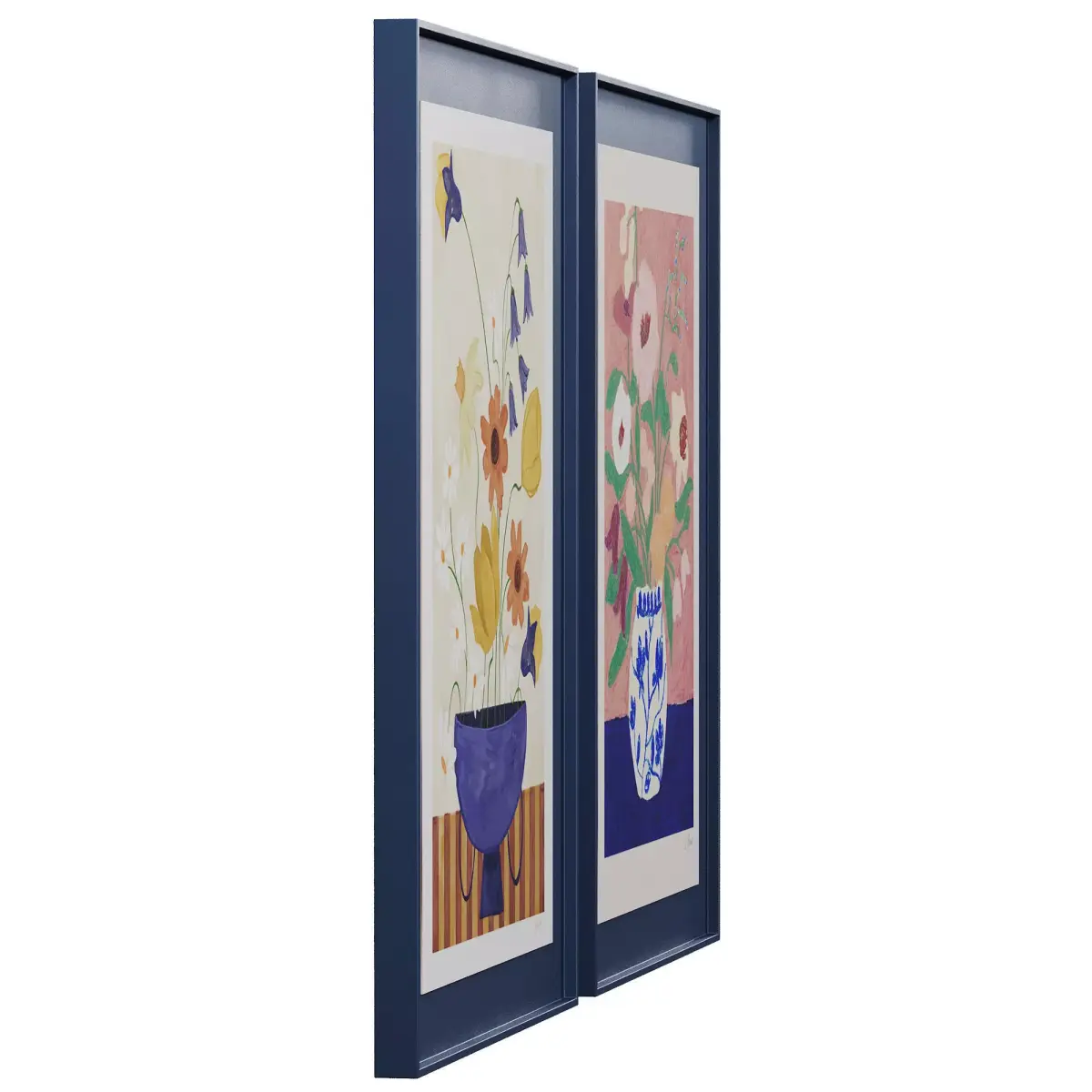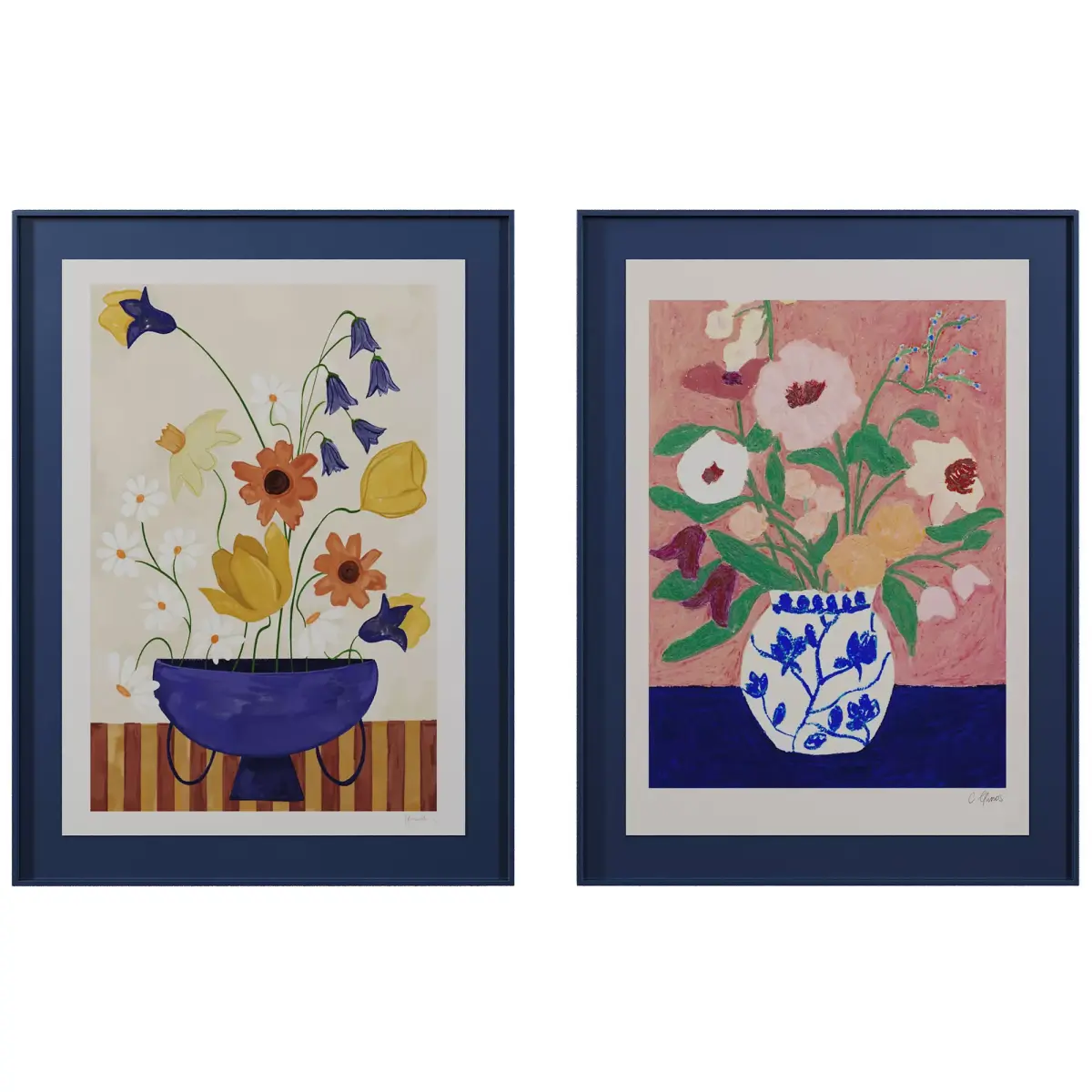 Art print pictures Colourful Bunch in Blue Vase by Frankie Penwill and Flowers on Blue Table by Carla Llanos for The Poster Club