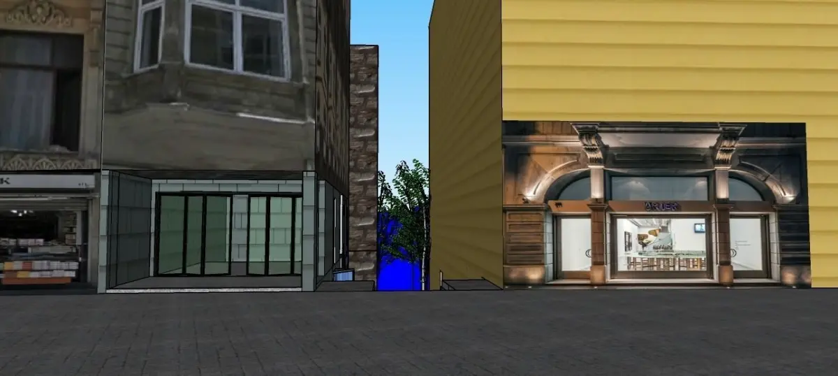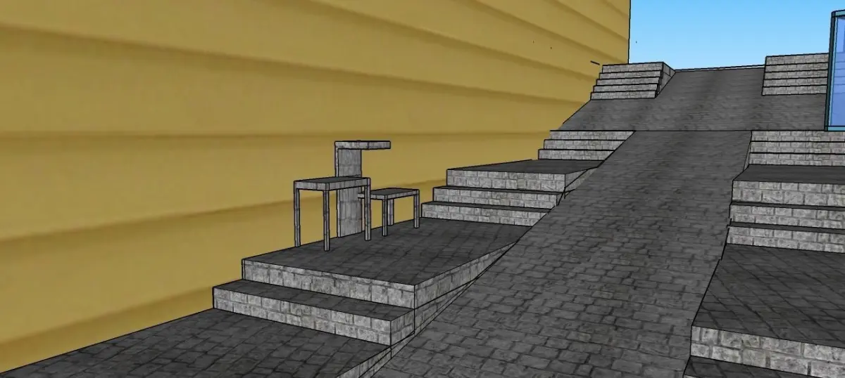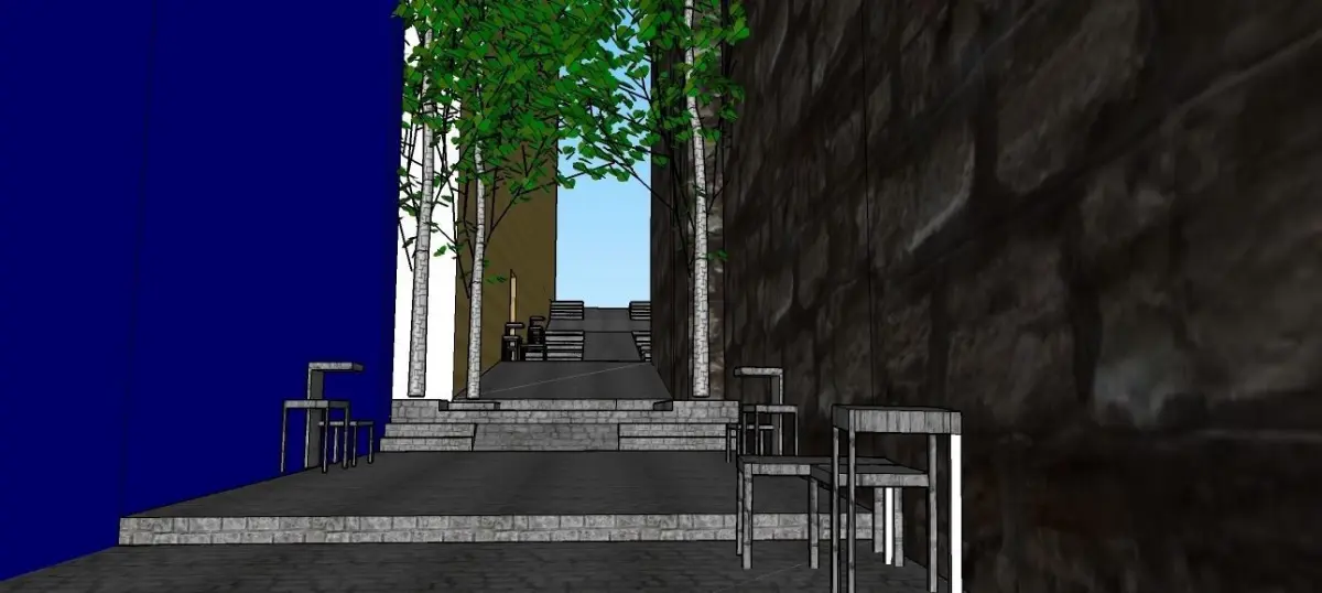 The street on a street was modeled and transformed into an art street. Stairs were terraced. Wood, stone, american siding, glass, metal, fabric materials were used. Inside the model are doors, windows, trees, tables, stairs, buildings.