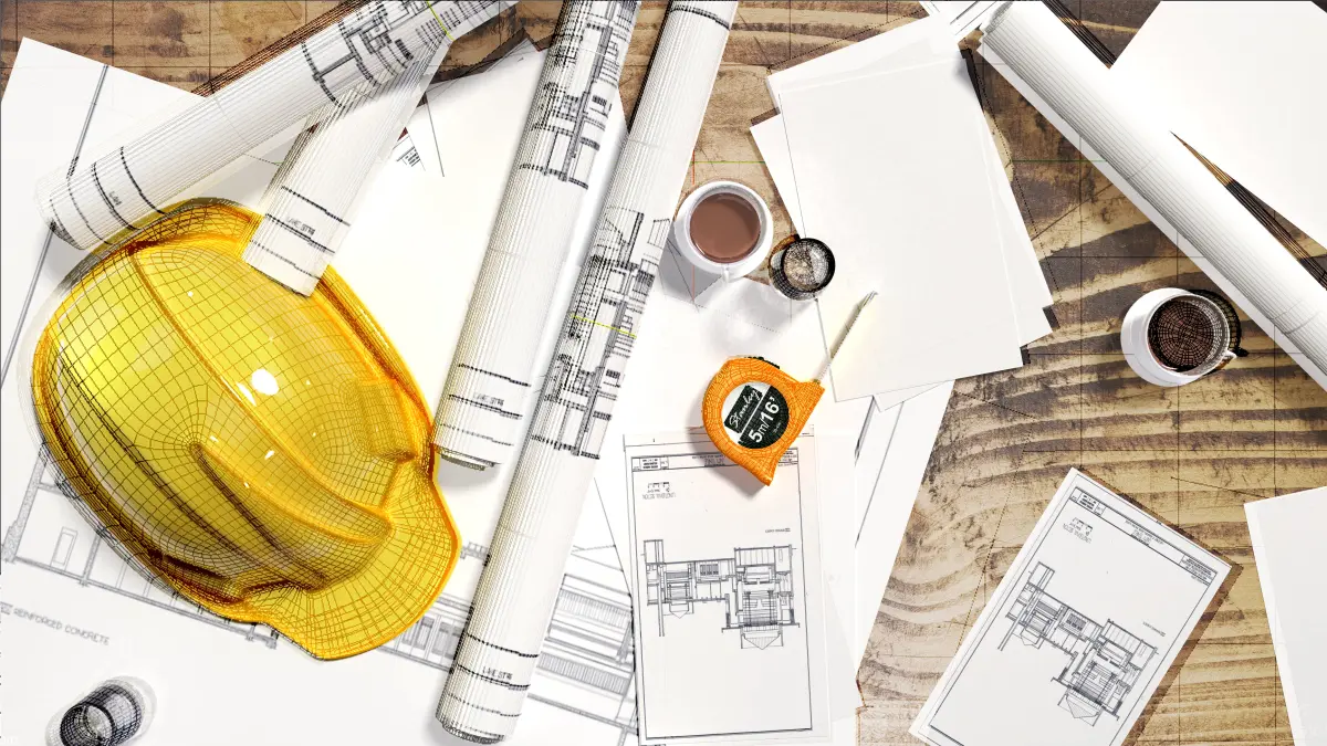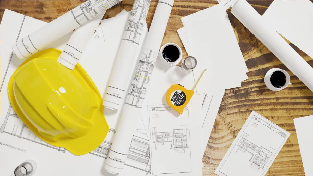 construction gear, helmet, tape measure, blue print, glass, cup