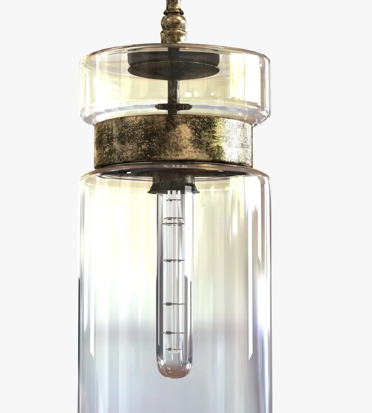 Garrison Cylindrical PendantH: 36.83cm Dia: 15.24cmMolded clear glass cylinder cinched with antique brass. Shown with antique tubular bul