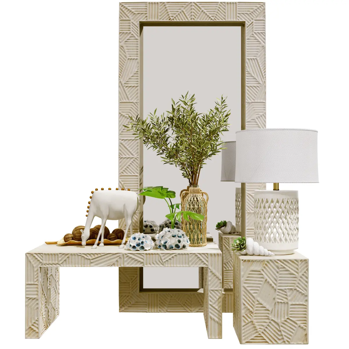 The Marsh Bench/Cocktail Table plays with elements that are recurrent in Beth Webb’s body of work-- texture, tension and serene tones. The carved blonde wood, which was inspired by a contemporary Italian woodworker, is deeply tactile, while a smoothtop contrasts the dramatic texture. Based on the form of a Parsons table, the Marsh is modular in concept and can be paired with the Marsh End Table, serving either as a coffee table or bench. The Marsh Floor Mirror plays with elements that are recurrent in Beth Webb’s body of work-- texture, tension, and serene tones. The scale of this full-length carved wood mirror, which was inspired by a contemporary Italian woodworker, carriesgravitas, as though it is a piece of sculpture in itself. The deeply grooved patterns in the wood juxtapose the slick mirror. Suitable for hanging or leaning on a wall, it could equally be hinged and transformed into a folding screen. The Marsh Bench/Cocktail Table plays with elements that are recurrent in Beth Webb’s body of work-- texture, tension and serene tones. The carved blonde wood, which was inspired by a contemporary Italian woodworker, is deeply tactile, while a smoothtop contrasts the dramatic texture. Based on the form of a Parsons table, the Marsh is modular in concept and can be paired with the Marsh End Table, serving either as a coffee table or bench.