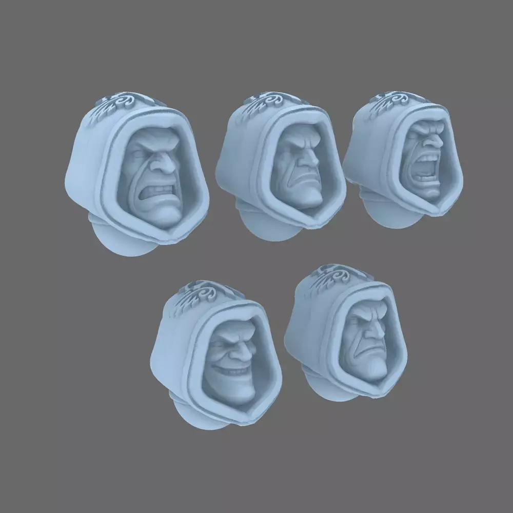 Come check out our Arthurian Knights V10 Hooded Faithful Heads. These come with intricate 3D designs that make painting a breeze. This product comes with five different sculpts of Arthurian faithful wearing hoods. The hood has the simple Arthurian sigil. This product is suitable for your favorite 28mm scale models of Grim Dark-themed Superhuman Armored Warriors of Humanity, like a Prime Master.