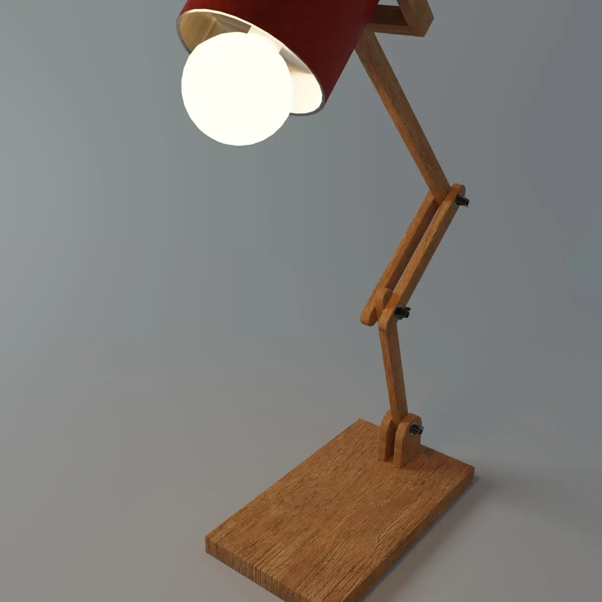 Hinged table lamp, this lamp has a wooden base and poles with a red dome covered with leather.