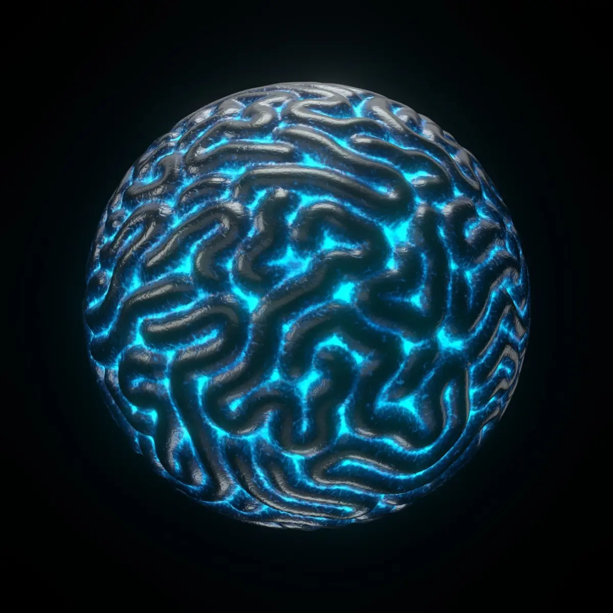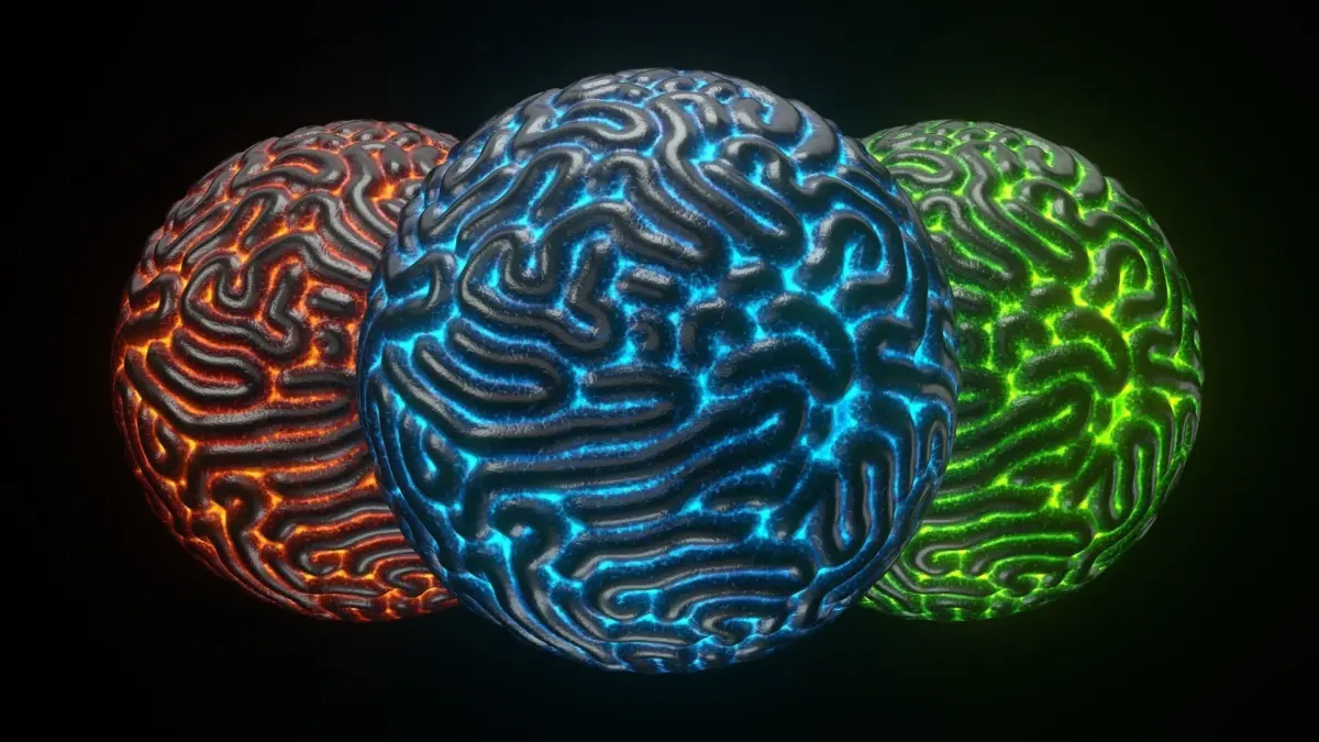 spherical Artificial (or alien) Brain in with glowing details. 4K PBR textures with 3 variation of emissive color variations, Created with Cinema 4D R23, Substance painter.