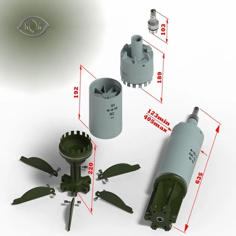 I present a 3D model of an anti-tank cumulative artillery projectile of 122mm caliber.