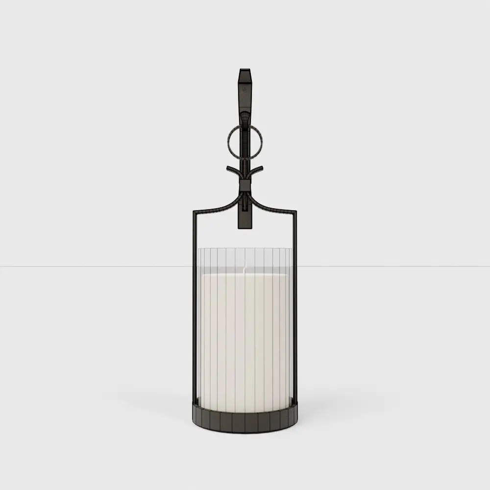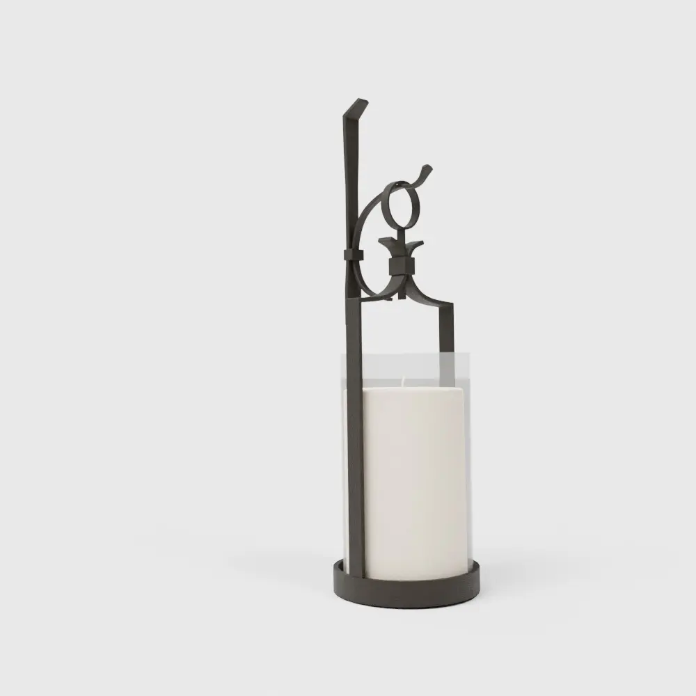 Crafted of cast aluminum for strength with a distressed and blackened bronze finish for a forged look.Dust with a soft, dry texture.Overall:5.5w x 6.25 d x 31hHolds:3 x 6 pillar candle...