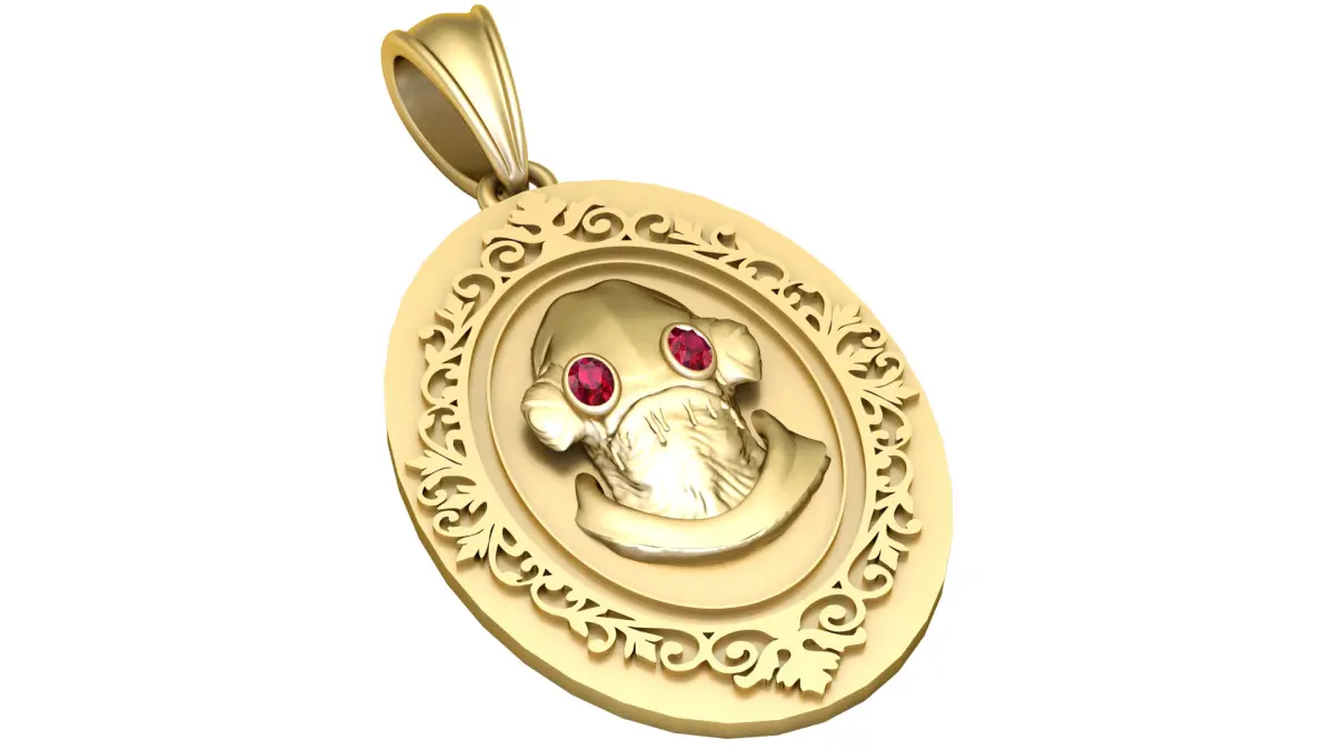Presenting a highly artistic gold pendant that masterfully blends intricate craftsmanship with unique design elements. The centerpiece features an exquisitely detailed sculptural figure, highlighted by two vivid red gemstones that serve as captivating eyes, adding life and character to the piece. Surrounding the central motif is an elegant oval frame, meticulously decorated with ornamental floral patterns that enhance the pendant’s regal and antique-inspired appeal. This pendant stands out as a one-of-a-kind collectible, perfect for those who appreciate bold artistic expression fused with luxury jewelry aesthetics.