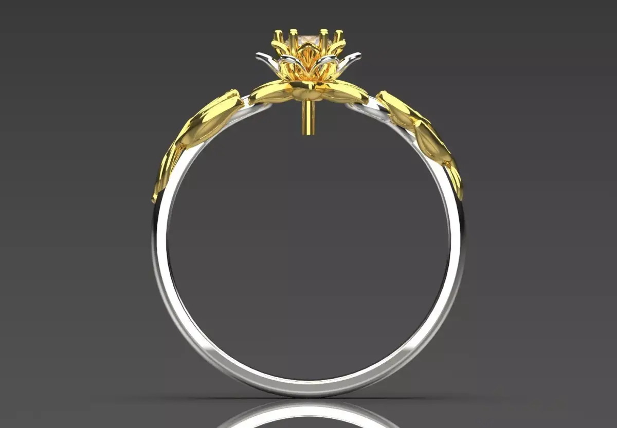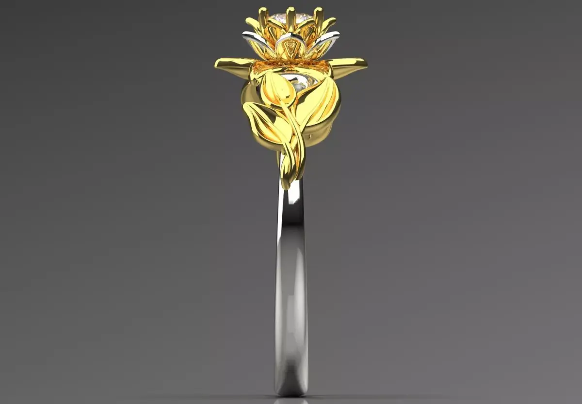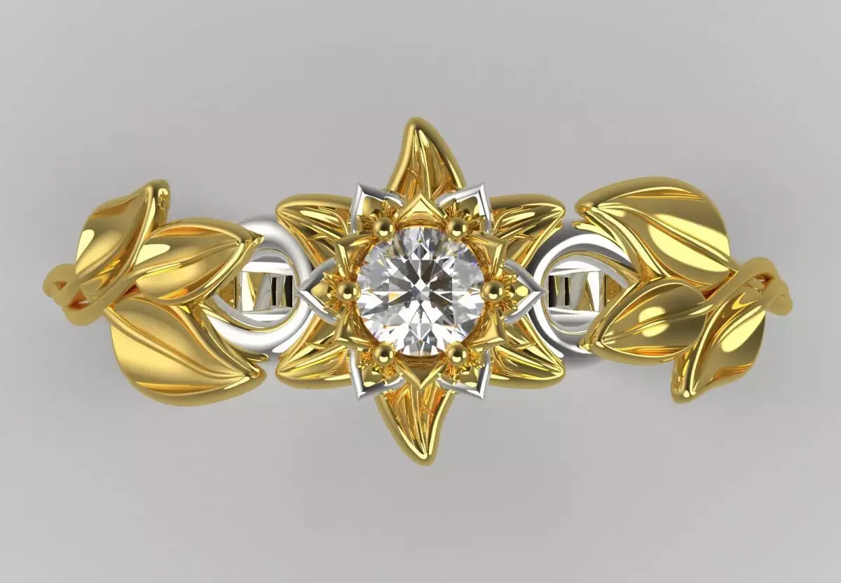 This SR0094 ring is a stunning piece of jewelry with an artistic design inspired by nature, which has a unique effect by combining two colors of gold. The main body of this ring is made of polished white gold, while the flower and leaf design are made of shiny yellow gold. The main focus of this jewelry is a sparkling round brilliant diamond in its center, which is located among the golden petals.