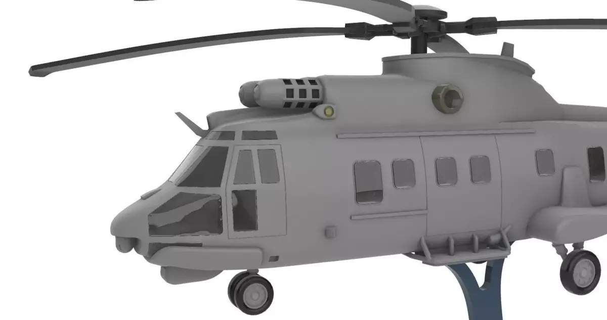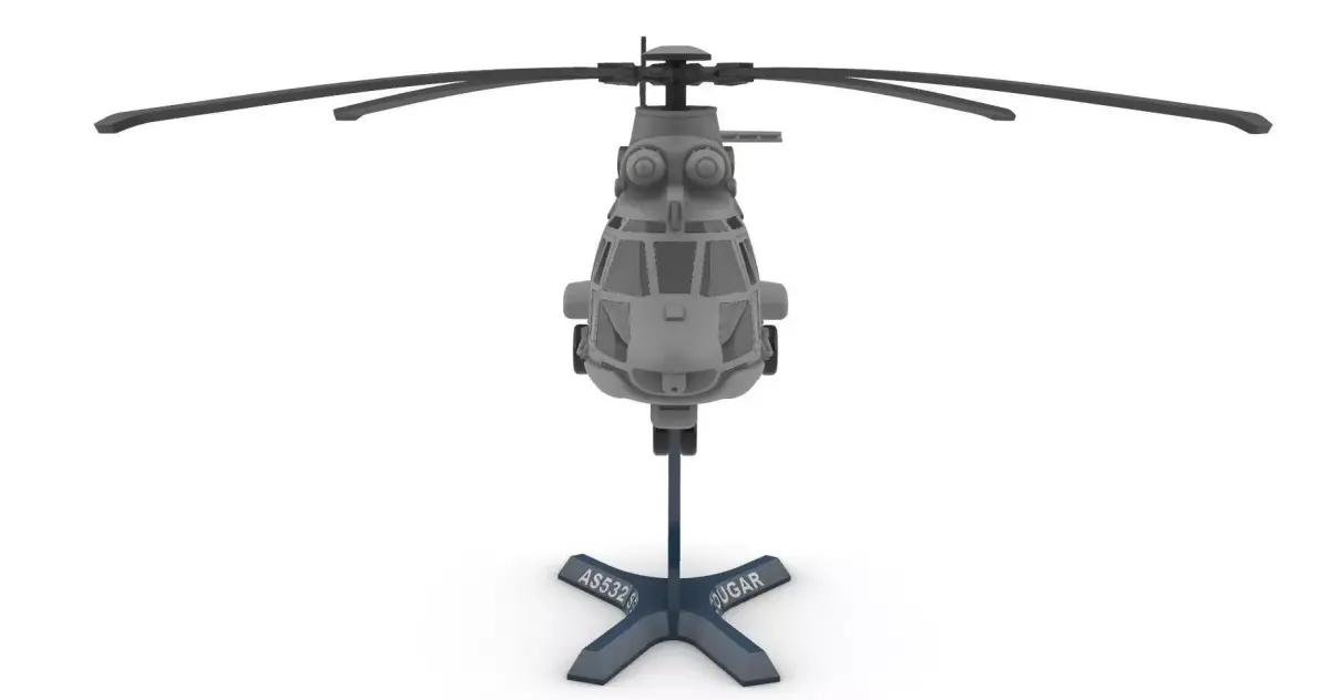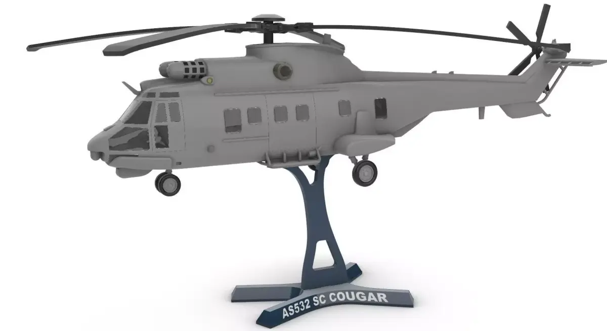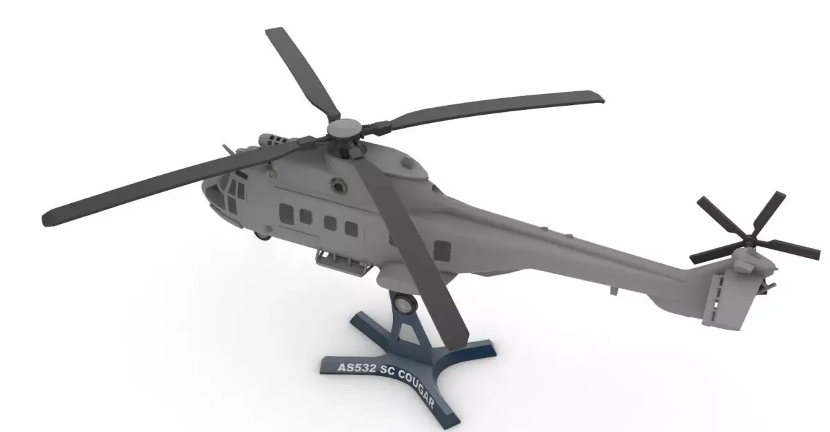 AS532 SC (Naval Cougar) SummaryThe AS532 SC is the naval variant of the AS532 Cougar military helicopter, specifically designed for shipborne operations and maritime environments. Used by countries such as Turkey, it combines strong transport capability with advanced naval mission systems.Key Features of the SC Variant• Maritime-optimized construction: anti-corrosion protection, reinforced components, and systems adapted for salty, humid environments.• Multi-mission capability: troop transport, maritime patrol, search and rescue (SAR), medical evacuation, and logistical support.• Naval sensors and avionics: maritime search radar, optional FLIR/EO systems, and enhanced navigation equipment.• Shipborne operation: fully compatible with frigate and corvette flight decks, with folding blades in some configurations.• High performance: dual Makila engines providing reliability and power even in harsh sea conditions.AS532 SC Cougar Model – 3D Print File• Accurate proportions based on the real helicopter• Clean, well-defined lines ideal for any 3D printer• Visible structural detailing for a realistic look• Included display stand for elegant presentation• Print-optimized design, stable and without fragile parts• Impressive size, perfect for collectors