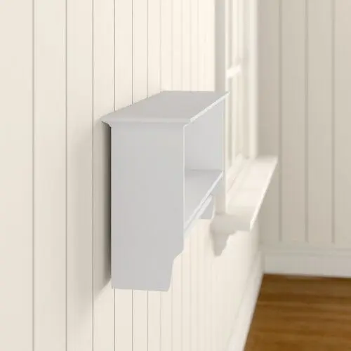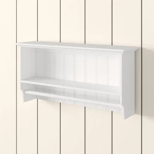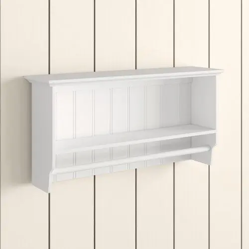- Ideal for storing and organising toiletries and towels in the bathroom, this wall-mounting shelving unit has a traditional yet versatile style. It is made from wood and has a lacquer finish. It includes an open shelf and a long towel rail.