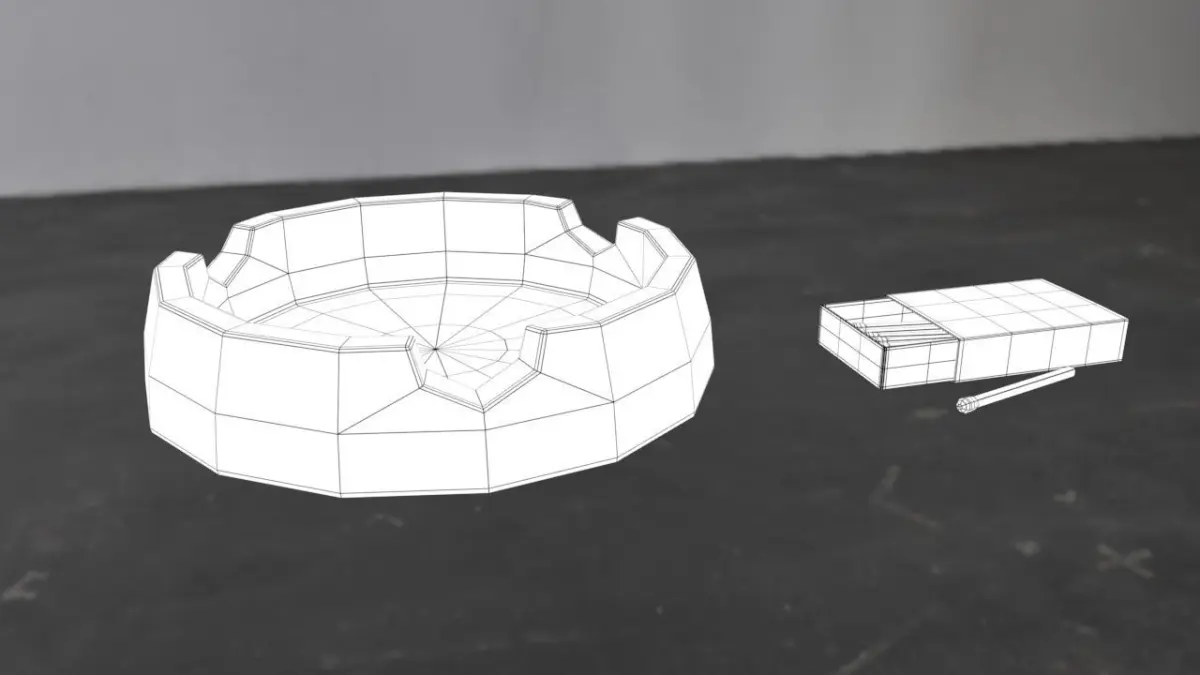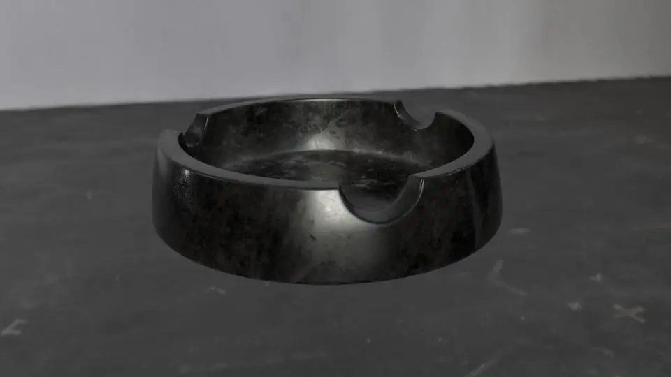 A small set of an ashtray with subtle ash visible on the inside, with a matchbox on the side having a used edge where the match usually scratches. A good amount of roughness and scratches is added to imitate real life.