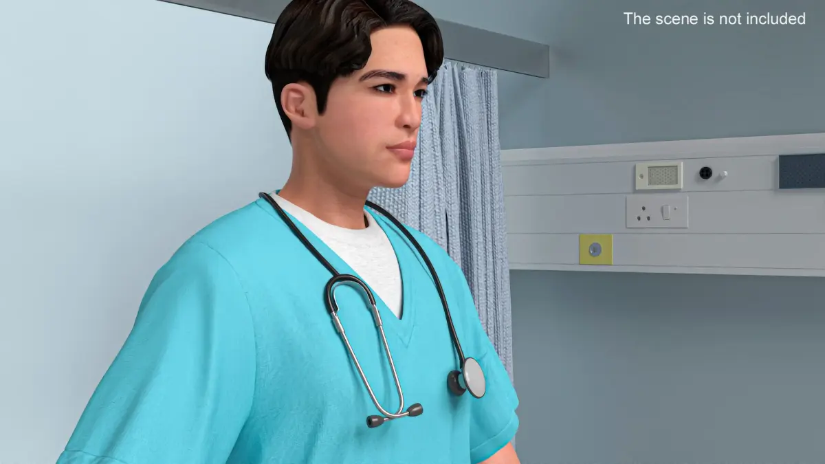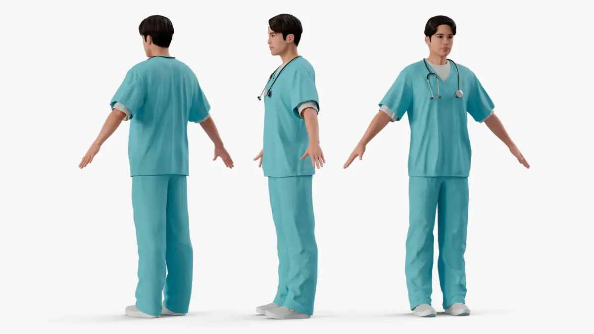 Asian Medic with Stethoscope A-Pose is a 3d model of man in a standard healthcare uniform, frequently worn by medical practitioners in hospitals and clinical settings.