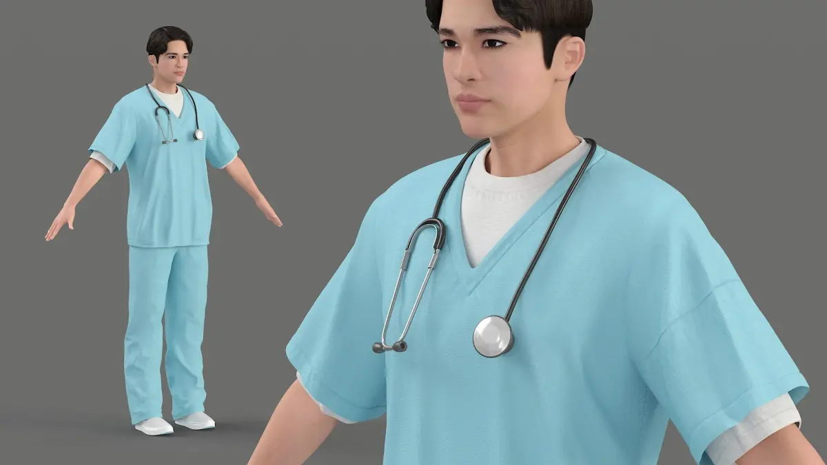 This model features a realistic depiction of a healthcare professional clad in a light blue scrub set, complete with a stethoscope around the neck, showcasing a typical outfit worn in medical environments. The scrubs are designed for comfort and practicality, providing ease of movement for various medical procedures.