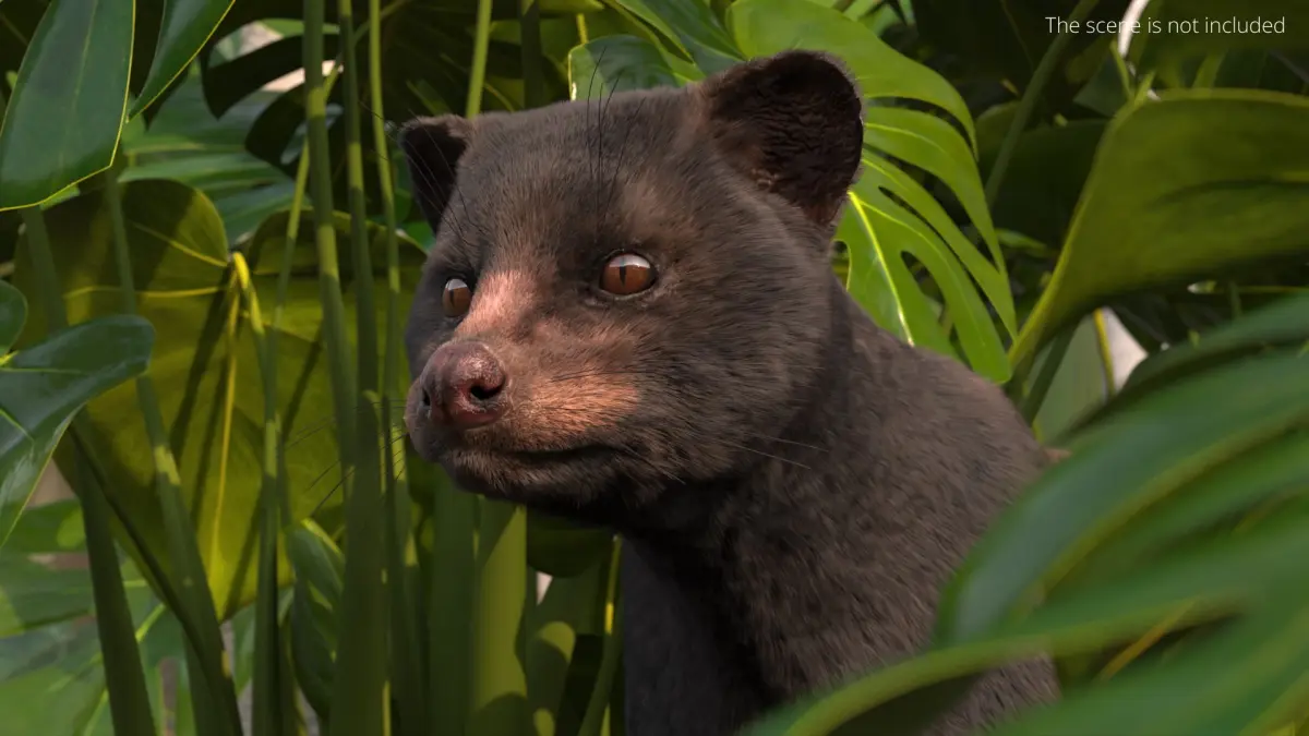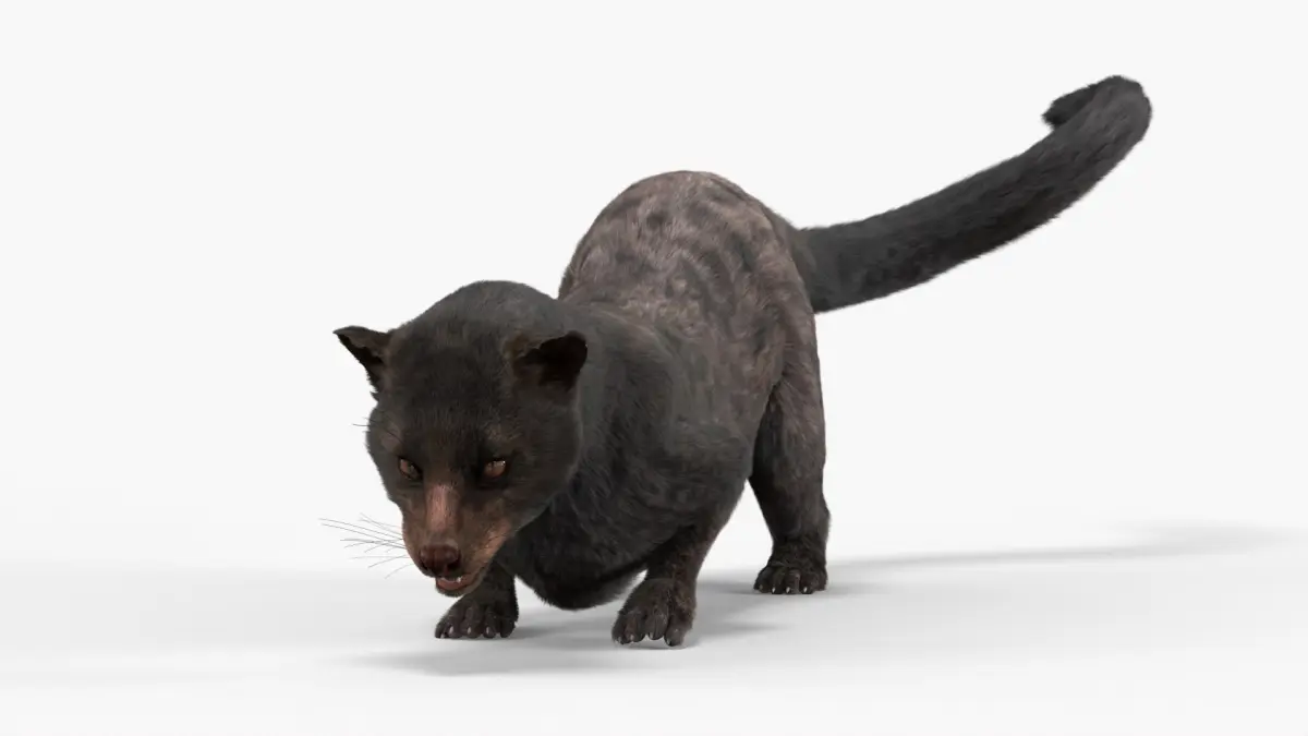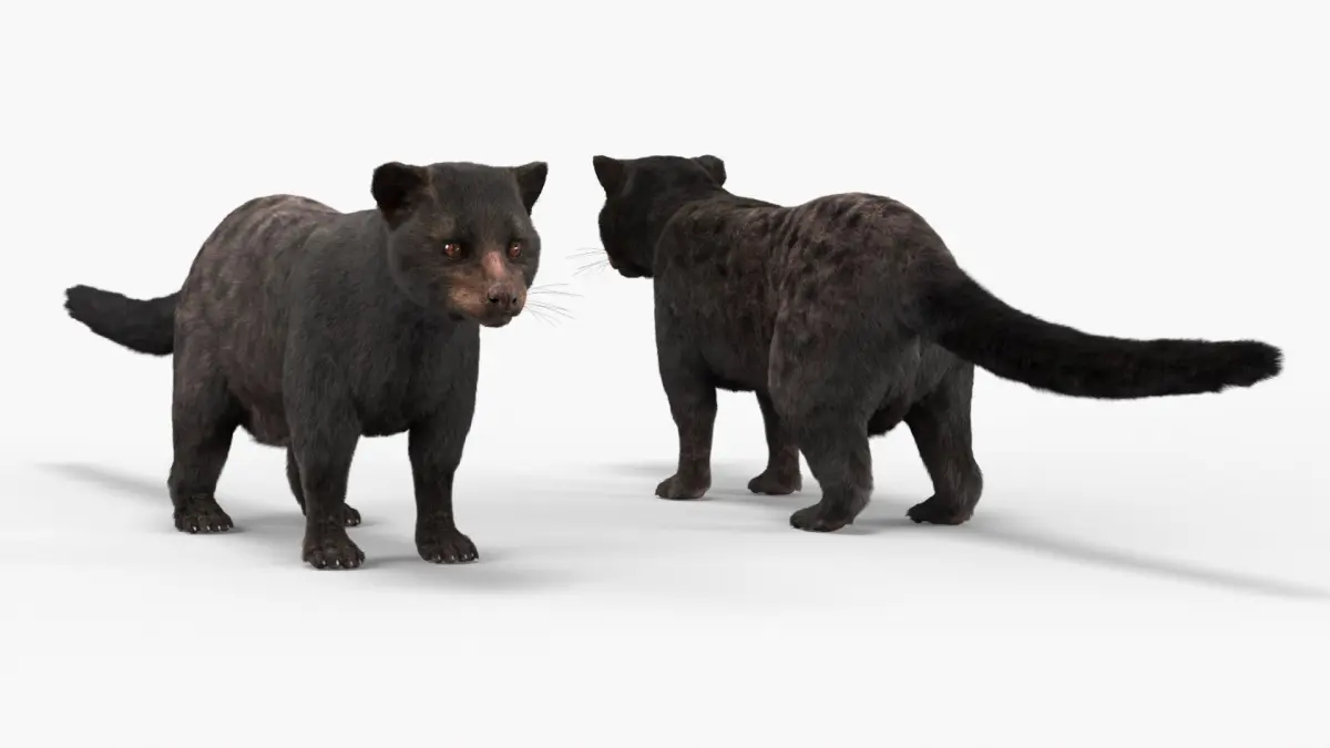 Asian Palm Civet Musang Dark Coat Fur Rigged is a three-dimensional model of Paradoxurus hermaphroditus (civet, musang or toddy cat), that is a small nocturnal mammal native to South and Southeast Asia.