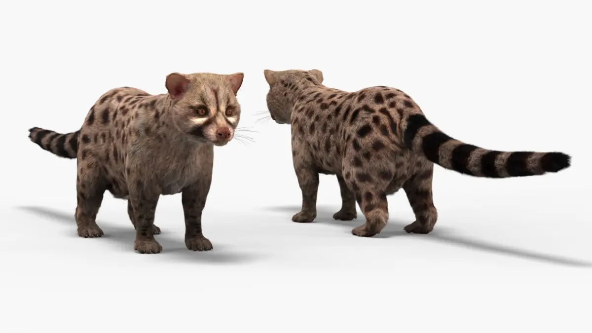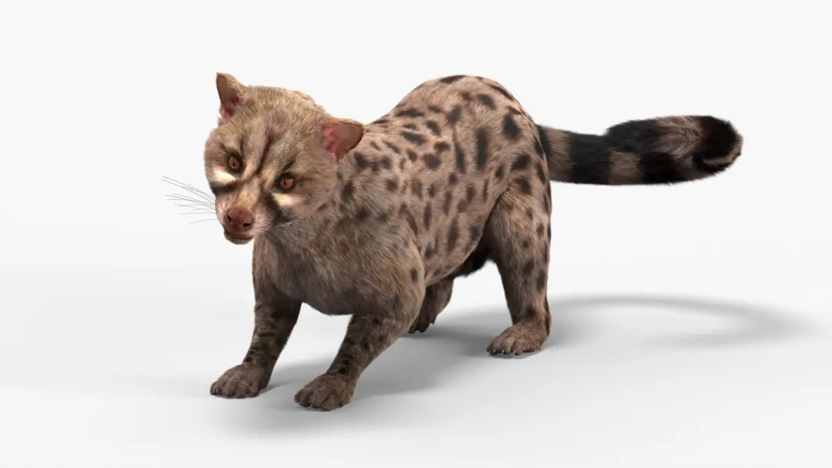 Asian Palm Civet Musang Spotted Coat Brown Fur Rigged is a three-dimensional model of Paradoxurus hermaphroditus (civet, musang or toddy cat), that is a small nocturnal mammal native to South and Southeast Asia.