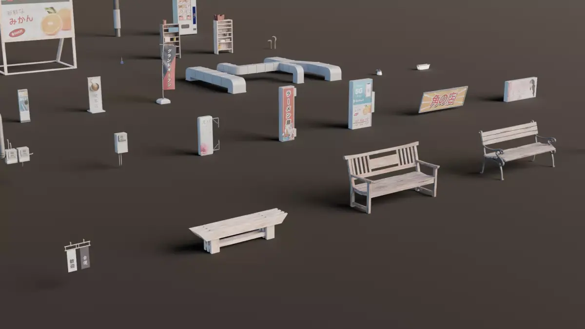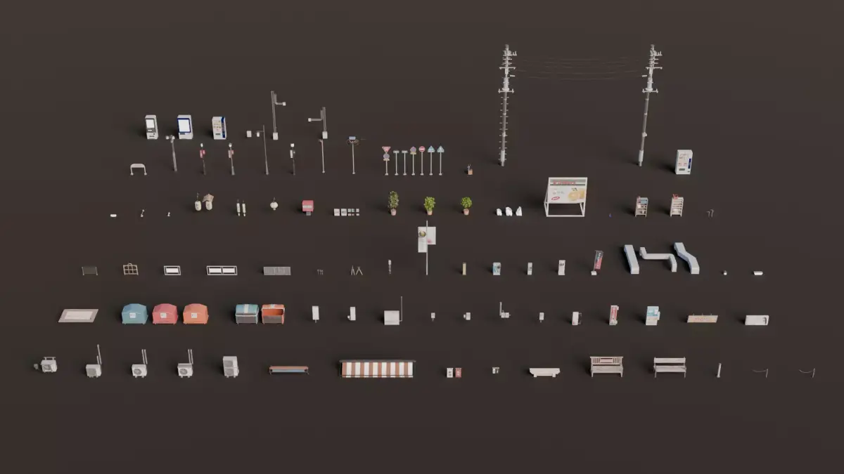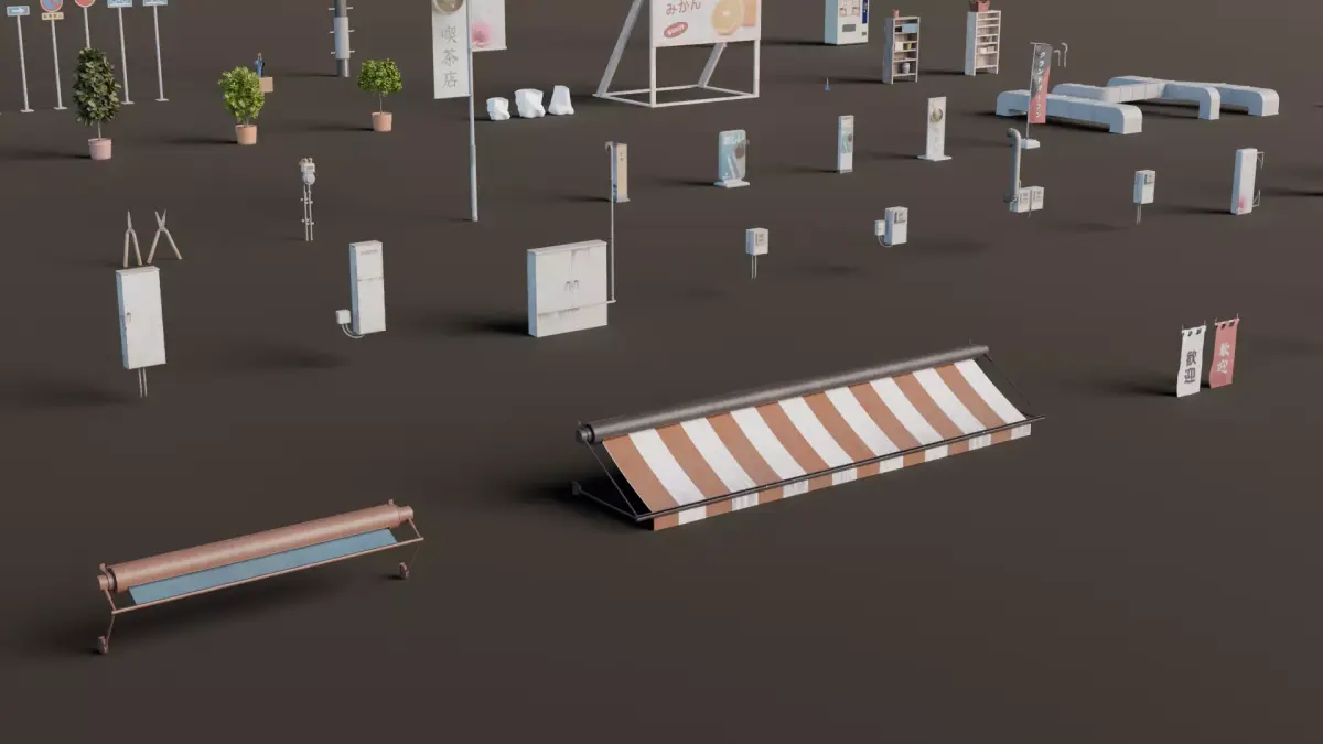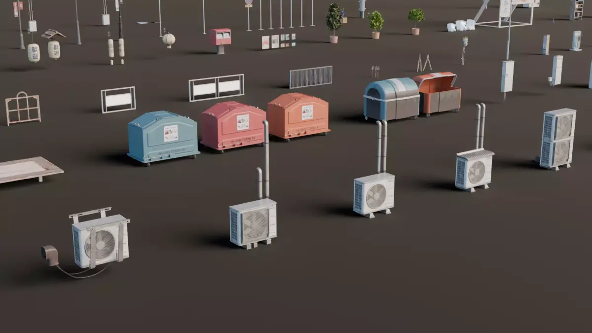 Object List:ACUnit — 5Awning — 2Banners — 2Bench — 3Bollard — 3Chabudai — 1Dumpsters — 2Electric Box — 3Electric Meter — 4Facade Sign — 5Fence — 5Garden Shears — 1Gardening Shovels — 1Gas Meter — 1Ground Sign — 6HVAC — 1Lamp — 5Lanterns — 3Mailbox — 1Posters — 1Potted Tree — 3Recycling Bags — 1Roof Sign — 1Scissors — 1Shelf — 2Sickles — 1Street Barricade — 1Traffic Pole — 2Traffic Signs — 1Umbrella Rack — 1Utility Poles — 1Vending Machine — 4Water Heater — 1Weatherhead — 2Zabuton — 1street Lamp — 5