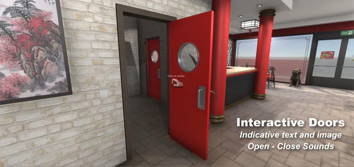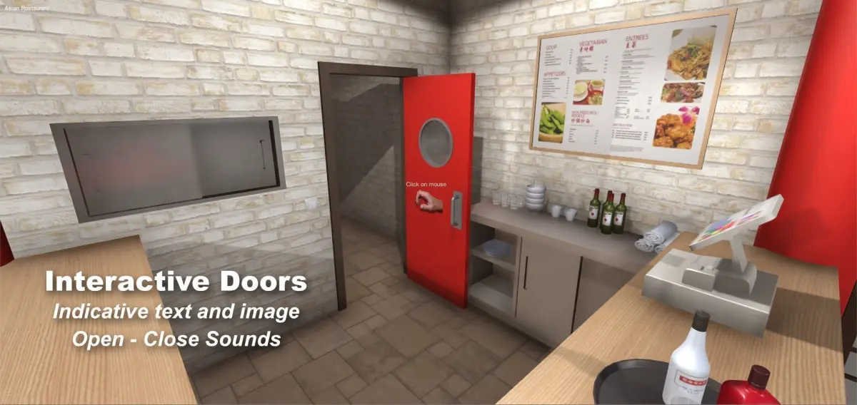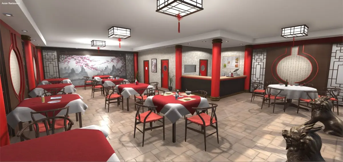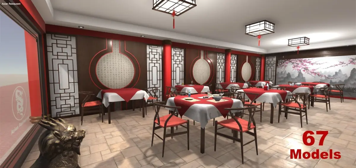 Interior of an Asian Restaurant with furniture and decoration that could be found in a real one originally created for Unity. There is a total of 67 models of tables, chairs, tablecloths and different models of crockery and food. The Chinese style decoration of the walls is outstanding. There is also another kind of furniture like a cabinet and the bar. There are three types of doors that include open-close animation and are scripted with an indicative image and text (when pointing at the door) and have sound included to be able to interact in the scene. We can find other objects like pictures, plants, two kinds of lamps and decorative lions at the entrance. There are also the FBX models included separately, textures included, to be used in other 3D apps. This scene or the models individually are ideal for games or applications.