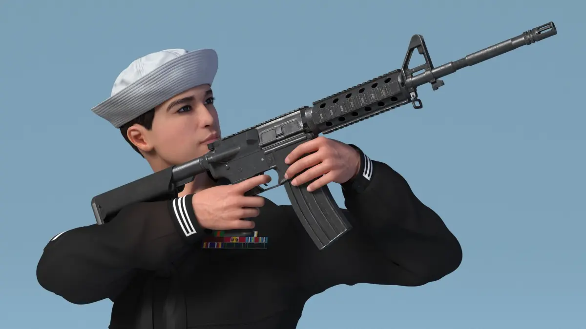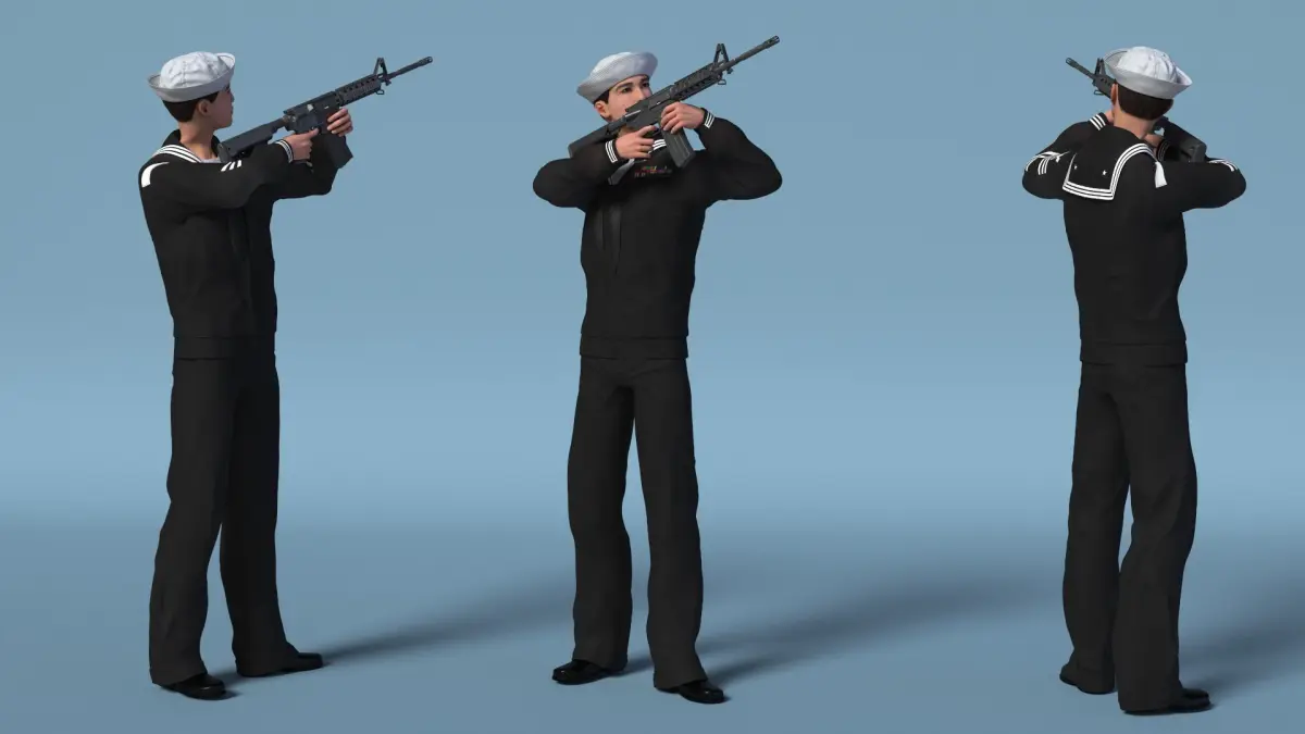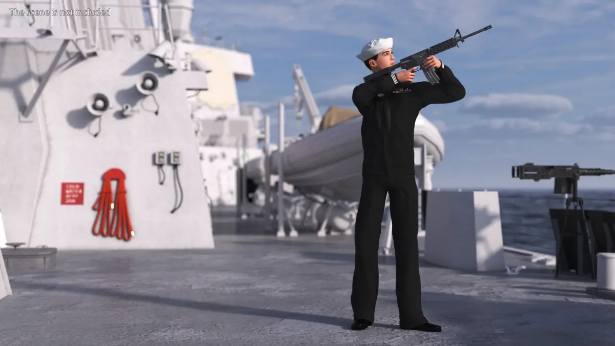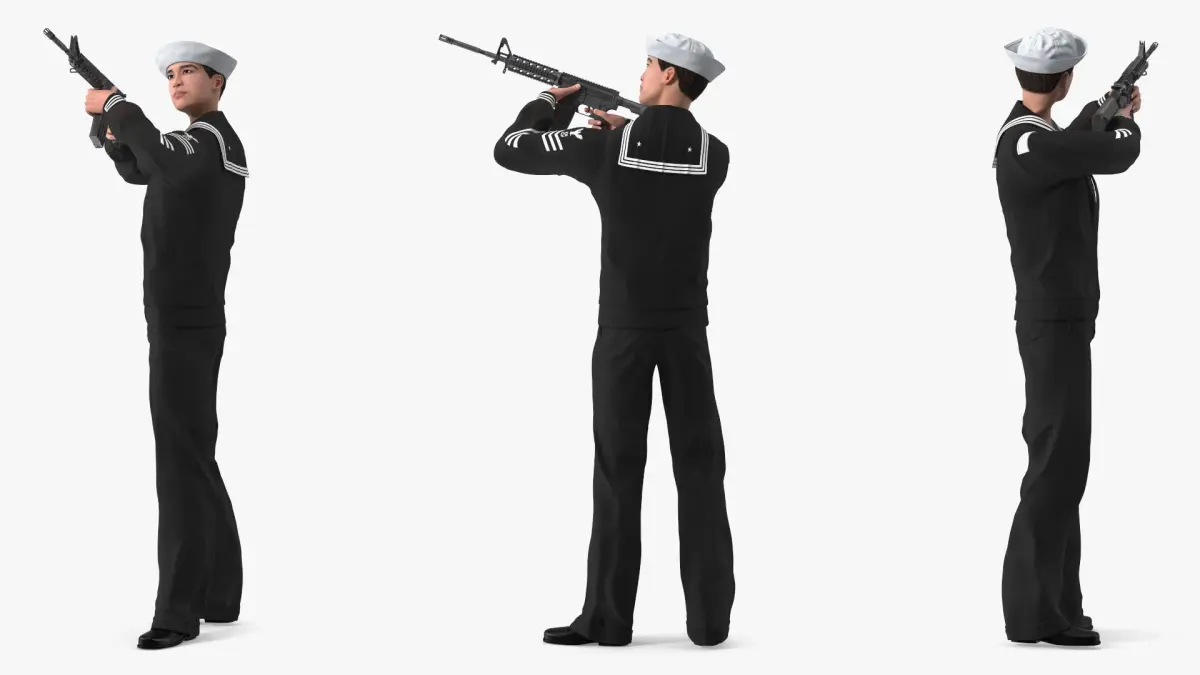 Asian Sailor in Black Uniform with Rifle is a three-dimensional model of a navy sailor in full dress uniform, holding a rifle.