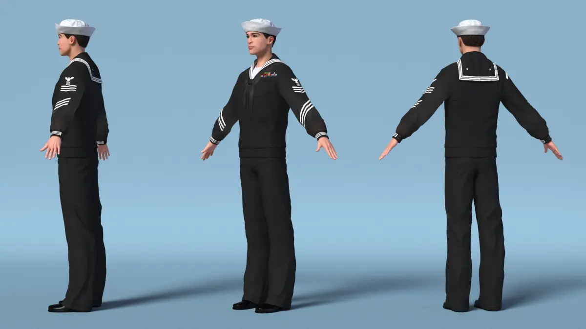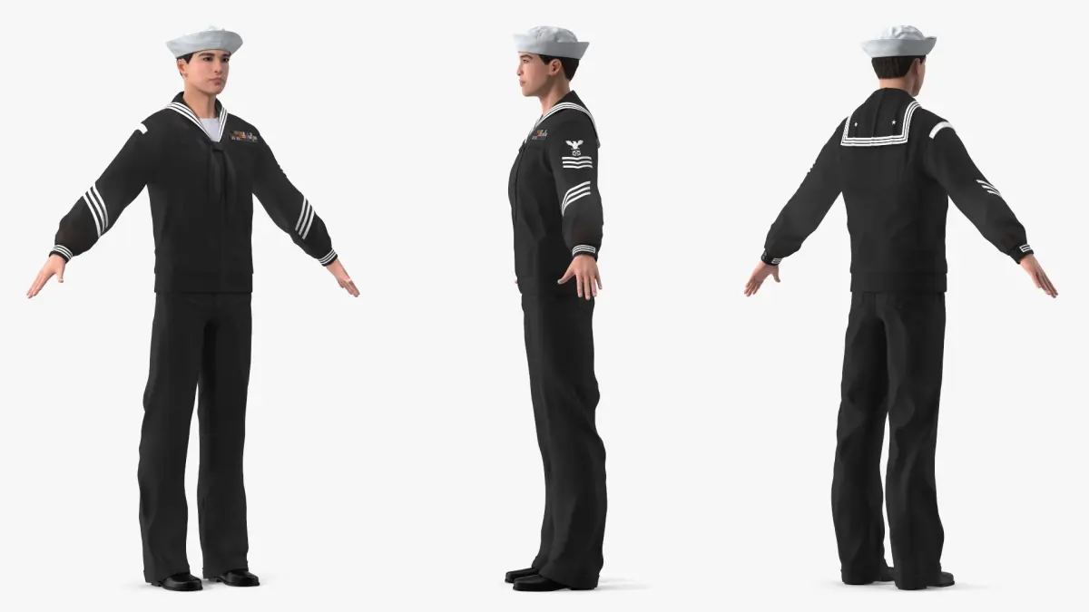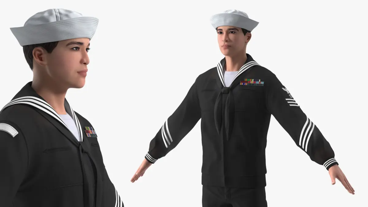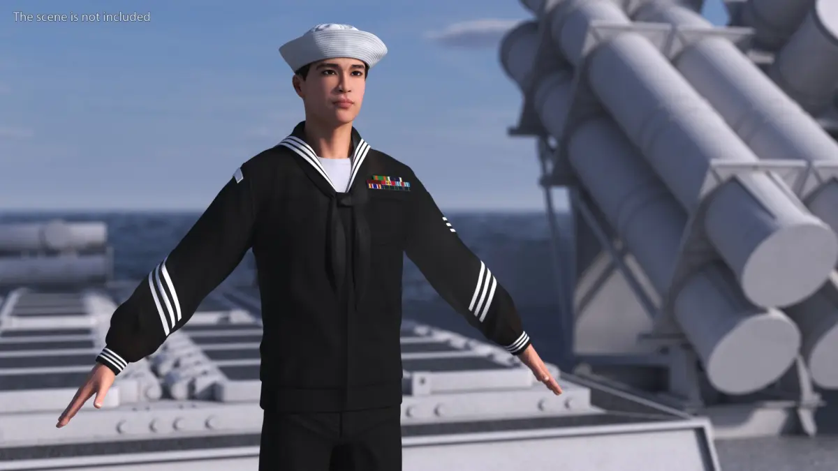 Asian Sailor US Navy in Black Uniform A-Pose is a three-dimensional model of a formal military attire, often referred to as a sailor's dress uniform, which is a specialized outfit designed for ceremonial occasions.
