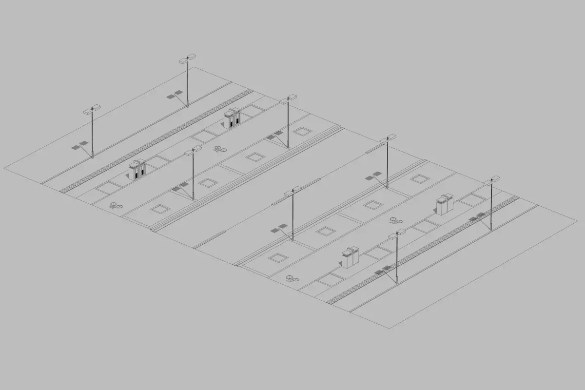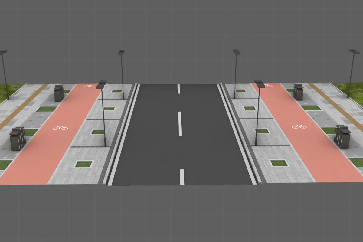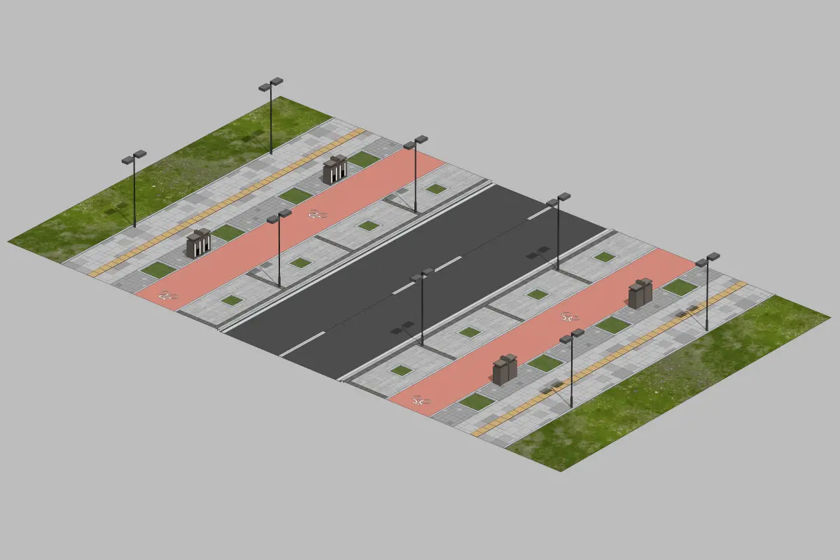 This 3D low-poly model represents a simplified urban road unit, designed for efficient rendering in real-time applications such as video games or simulations. The model features a central two-lane road flanked by sidewalks on both sides. The sidewalks are detailed with pedestrian pathways, small patches of greenery, and evenly spaced street lamps, providing a sense of urban infrastructure. The road includes lane markings and a median strip, enhancing realism. The surrounding areas are depicted with grassy patches, adding a touch of nature to the urban environment. The model's low-poly design ensures it remains lightweight while still conveying the essential elements of a typical city street layout. This makes it ideal for use in scenarios where performance is crucial, yet a recognizable urban setting is required.