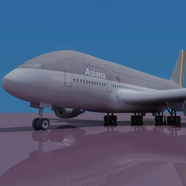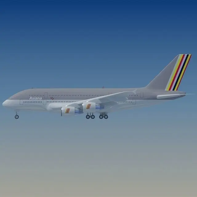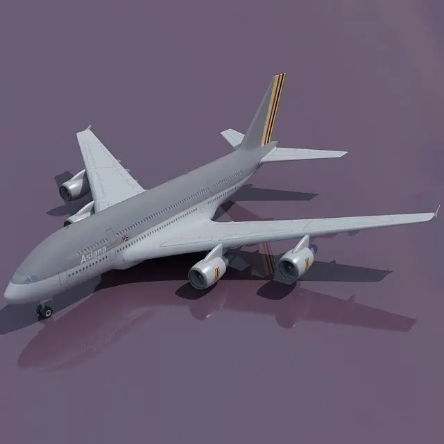High detailed 3d model of Airbus A380.Textured as Asiana with high-quality jpeg texture (2048 x 2048)Rendered with Vray.Vray settings included in .max 2008 version only.HDRI Map not included.