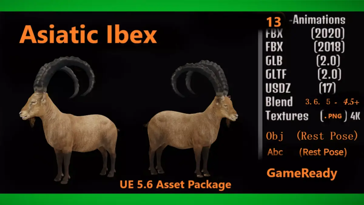 The Siberian ibex, also known using regionalized names including Altai ibex, Asian ibex, Central Asian ibex, Gobi ibex, Himalayan ibex, Mongolian ibex, Tian Shan ibex, is a polytypic species of ibex, a wild relative of goats and sheep. .3D Asiatic Ibex Realistic Animal Model By Nyilonelycompany (nyc).Thank you.