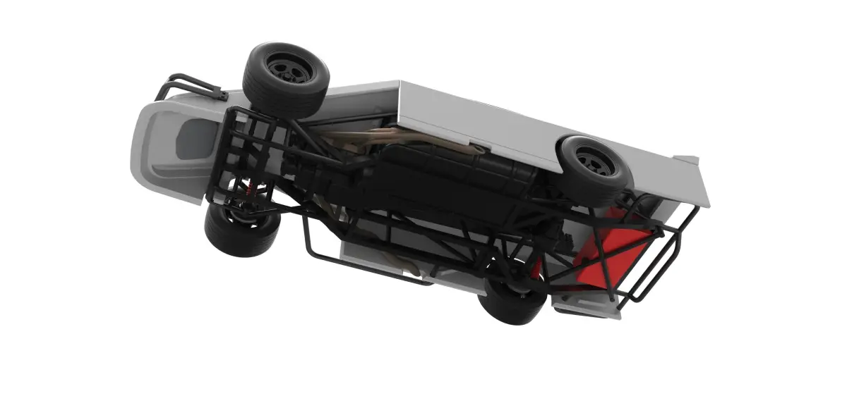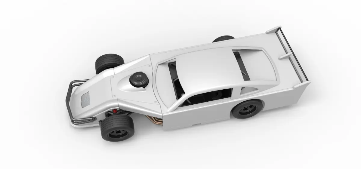 The model consists of parts: Air filter cap, Air filter, Body, Engine, Front bumper, Front grid, Left exhaust pipes, Radiator, Rear spoiler, Right exhaust pipes part 1,2, Rims, Seat part 1,2, Shell part 1-4, Shifter, Steering wheel, Tank, Tires.