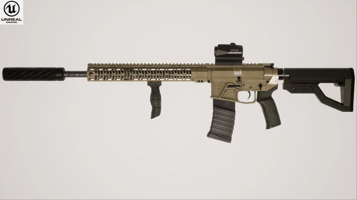 This Assault Rifle 1 Used is a high quality, photo real model that will enhance detail and realism to any of your rendering projects. File units - cm. The model has a fully textured, detailed design that allows for close-up renders, and was originally modeled in 3ds Max 2021 and rendered with Unreal Engine 5 and V-Ray.