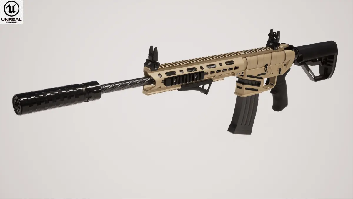 This Assault Rifle 2 is a high quality, photo real model that will enhance detail and realism to any of your rendering projects. File units - cm. The model has a fully textured, detailed design that allows for close-up renders, and was originally modeled in 3ds Max 2021 and rendered with Unreal Engine 5 and V-Ray.