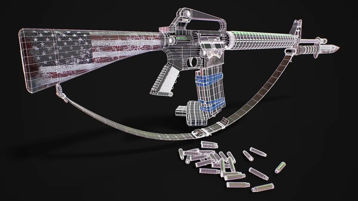 Hello. This is a high definition quality polygon of a Assault rifle 3D model with PBR textures. Extremely detailed and realistic. Suitable for movie prop, architectural visualizations, advertising renders, games, VR, AR. The archive includes Obj and FBX, textures for the Unity: Base color, Metallic, Mixed AO, Normal_OpenGL, Roughness. And also included in the archive textures for UE: BaseColor, Normal, OcclusionRoughnessMetallic. Textures made for large elements in 4K, for small ones in 2K. The number of materials corresponds to the number of main objects in the scene. Scene contains 16 materials. The model contains 225 objects: barrel, belt, bullets-91, case-118, charging_handle, double_magazine, ejection_port_cover, fire_mode_regulator, forward_assist_planger, front_ring, knife, magazine_empty, magazine_single, rear_ring, rear_sight, trigger, trigger_1. If you need, we will make a file of this model for 3D printing especially for you.