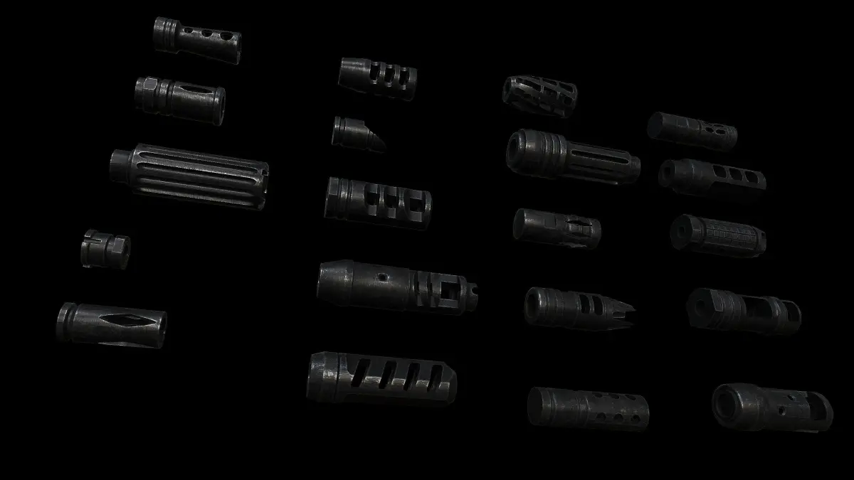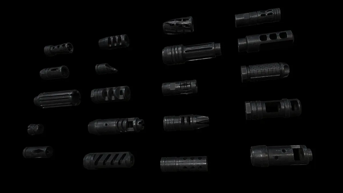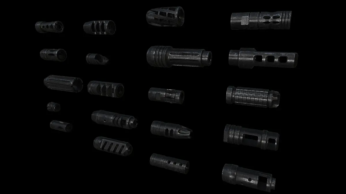 Title: Assault Rifle Muzzle Brake Collection #1Artist: JayMonkeyYear: 1/22/2025Subject: 3D Weapon Model Accessories