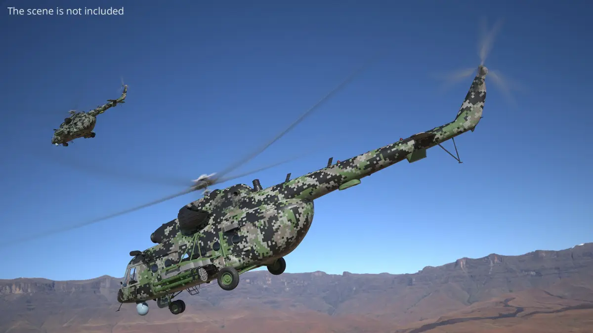 This detailed model depicts the helicopter with its rugged, camouflaged exterior, showcasing its capability for versatile operations. It features rotating blades and detailed landing gear, with emphasis on the powerful engines and troop carrying capacity. The design incorporates weaponry and defense systems, making it suitable for tactical missions.