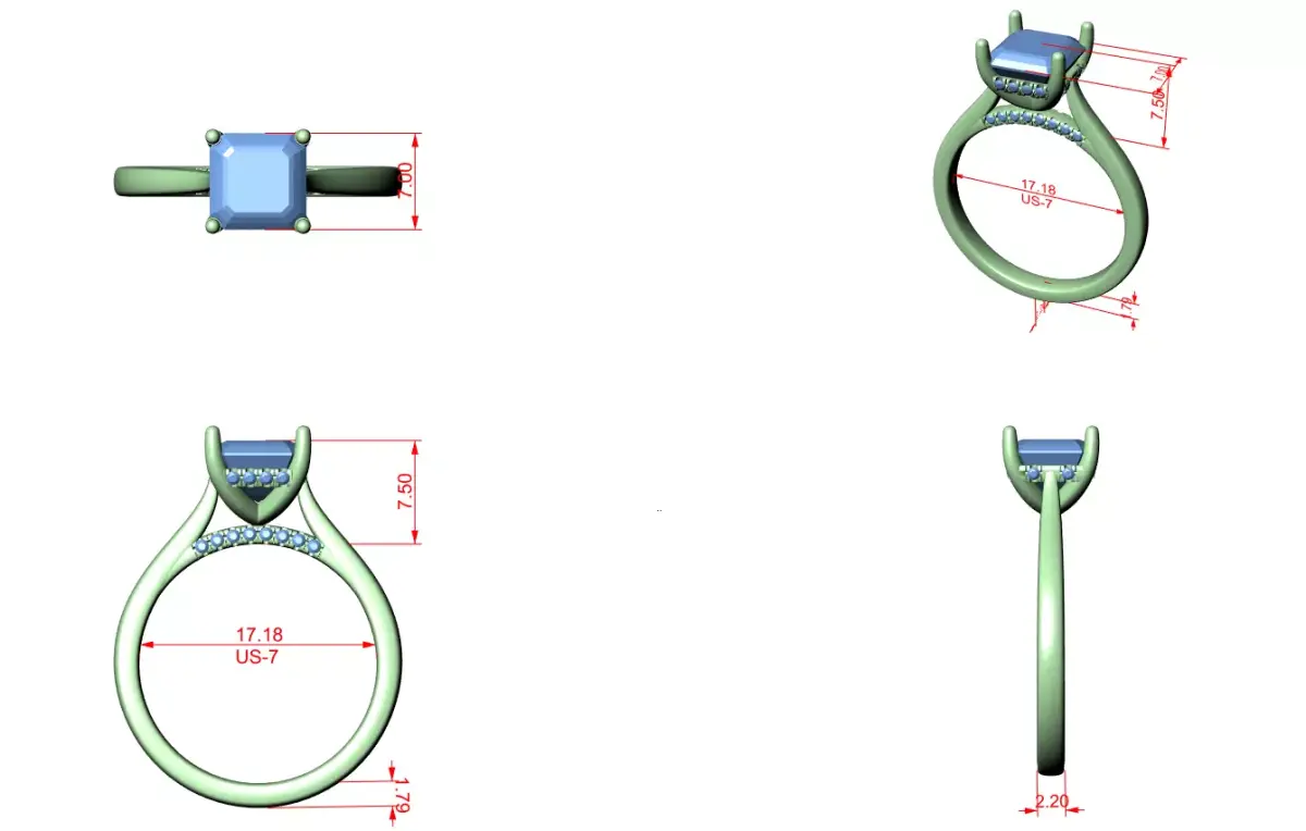 • Production-ready CAD model• Accurate Asscher cut stone seat• Secure four-prong setting• Hidden halo micro pave detail• Proper wall thickness for casting• Adjustable center stone size in 3DM• Clean geometry optimized for CAM processing