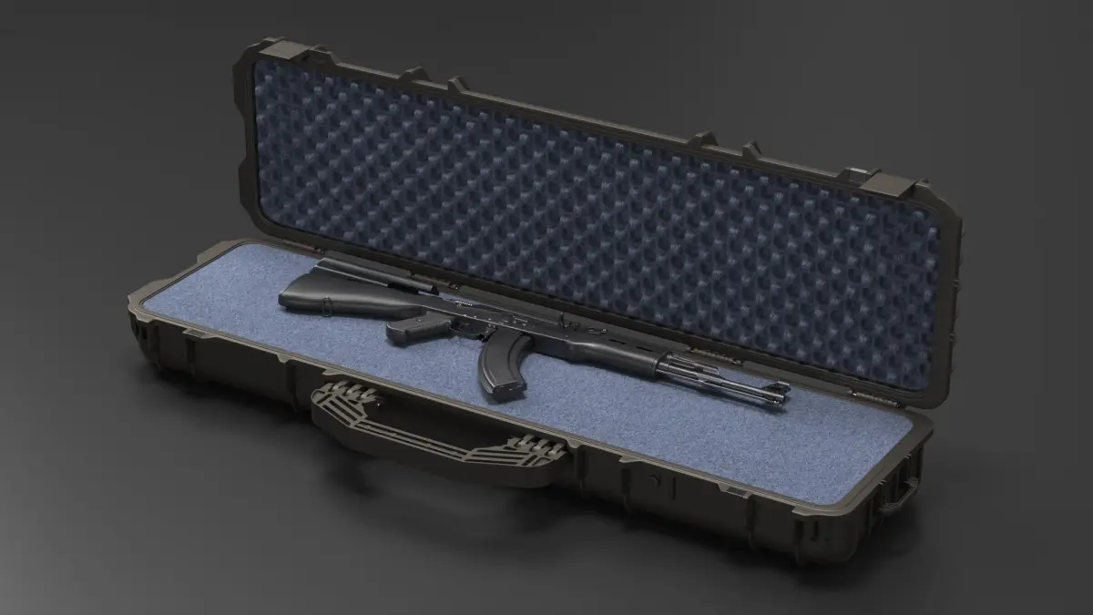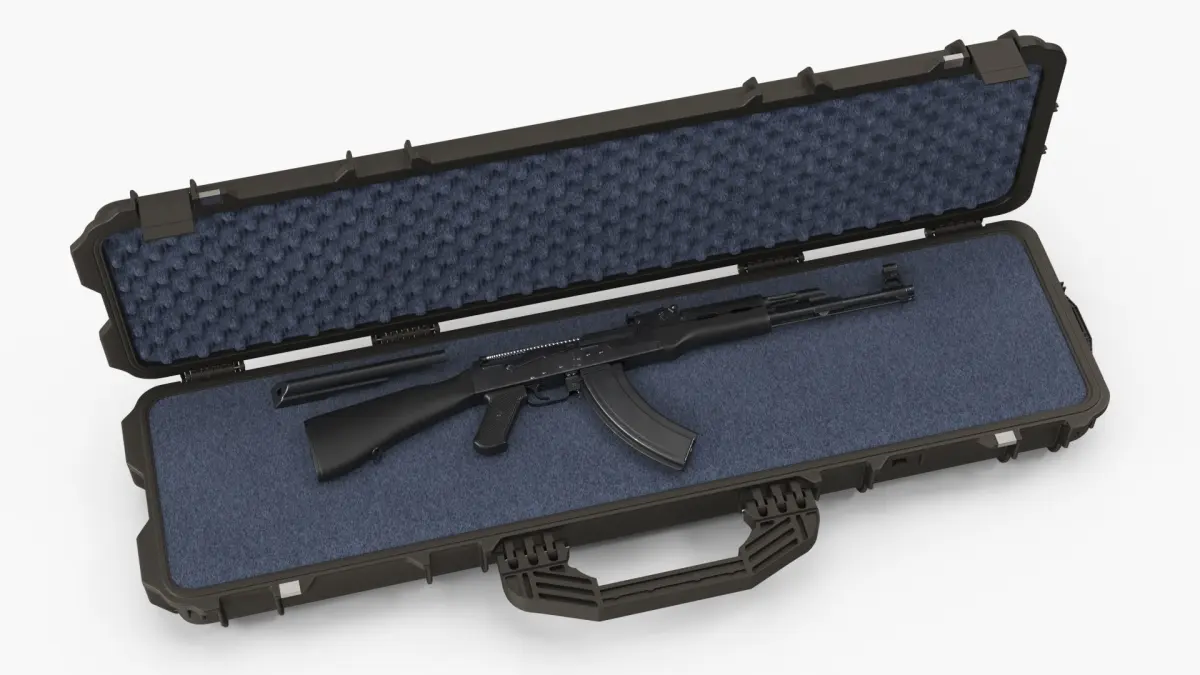 Assembled Black AK 47 in Open Hard Case is a three-dimensional model of the iconic AK-47 assault rifle, widely recognized for its rugged design and reliability in various combat scenarios around the world.