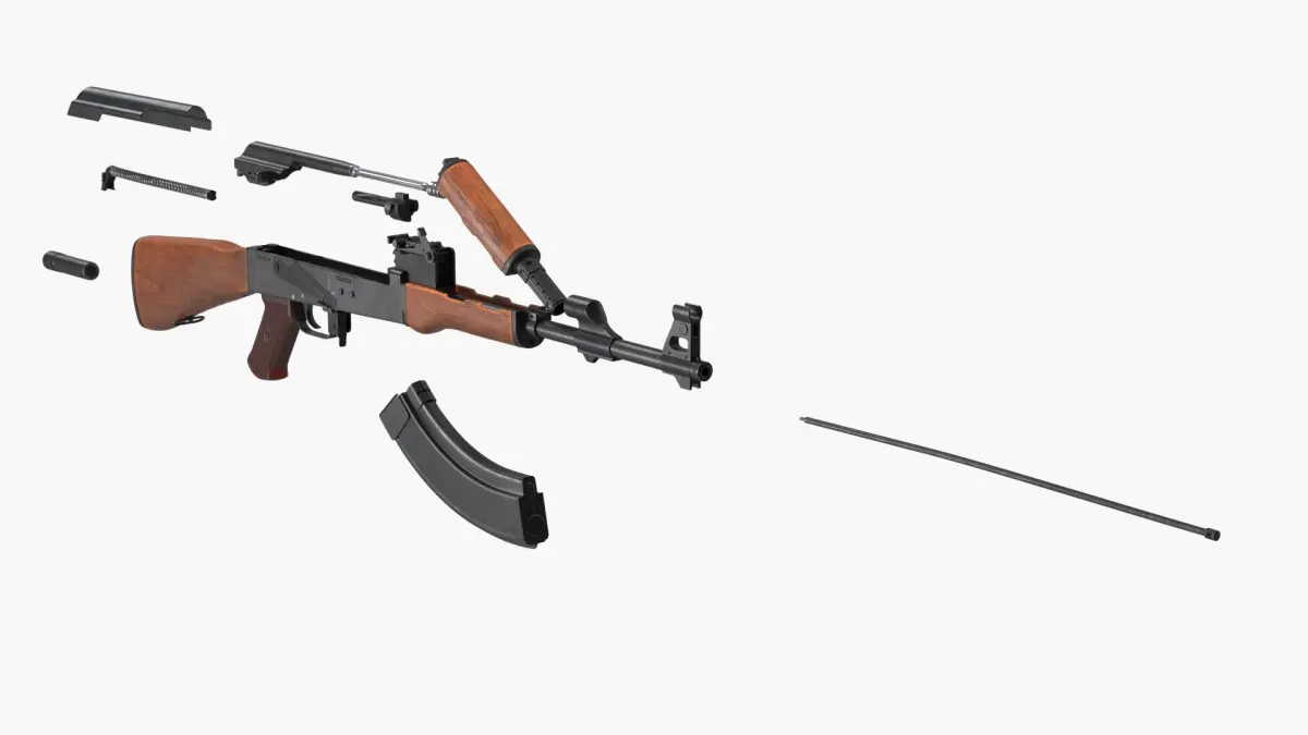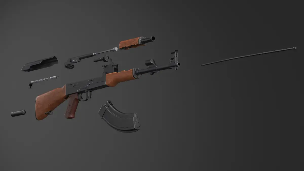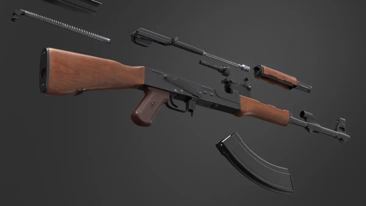 Assembling an AK 47 Rigged Animated for Maya is a three-dimensional model of the iconic firearm known for its reliability and widespread use across various military and civilian applications.